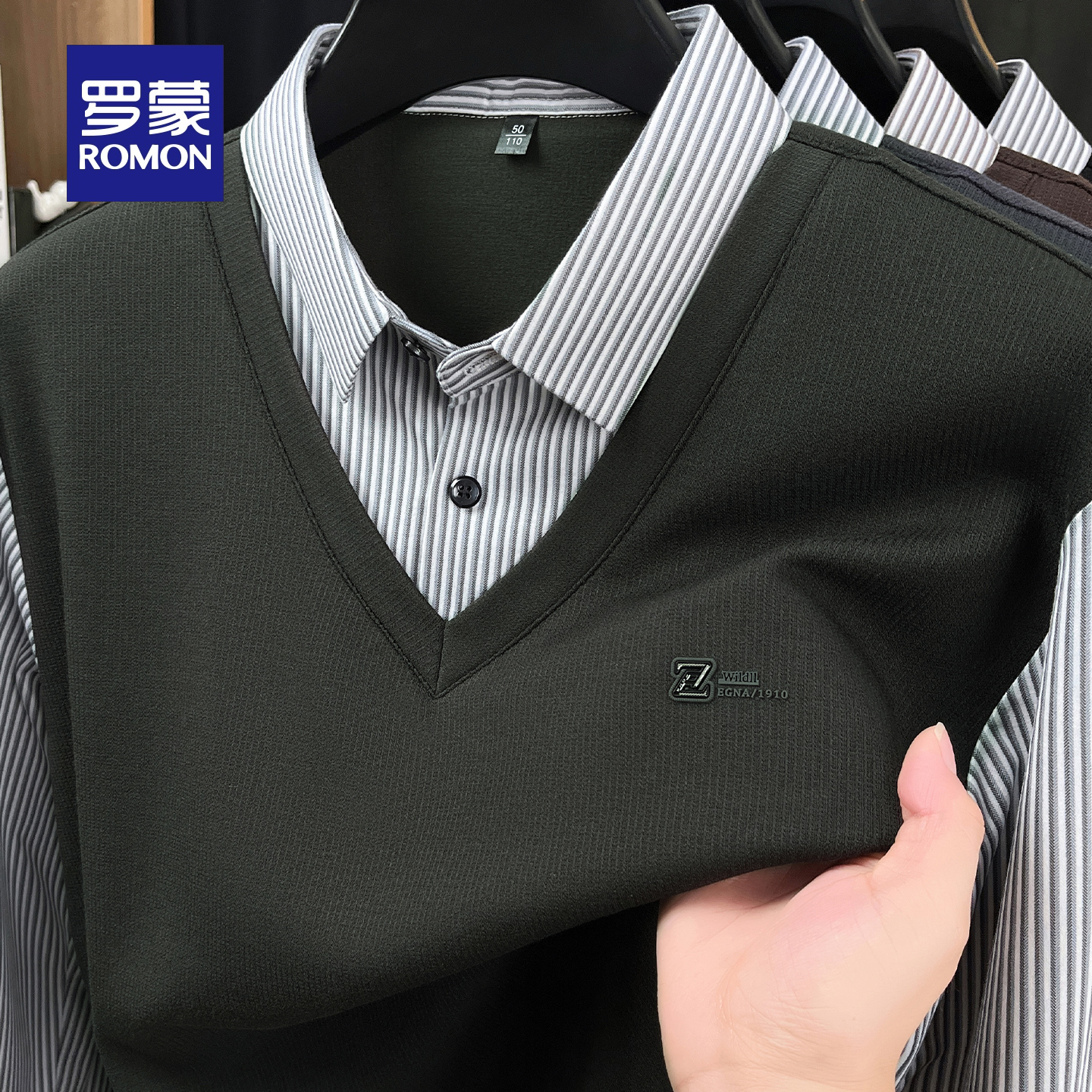 罗蒙条纹衬衫领假两件长袖t恤男士翻领秋季中老年爸爸秋装上衣MF