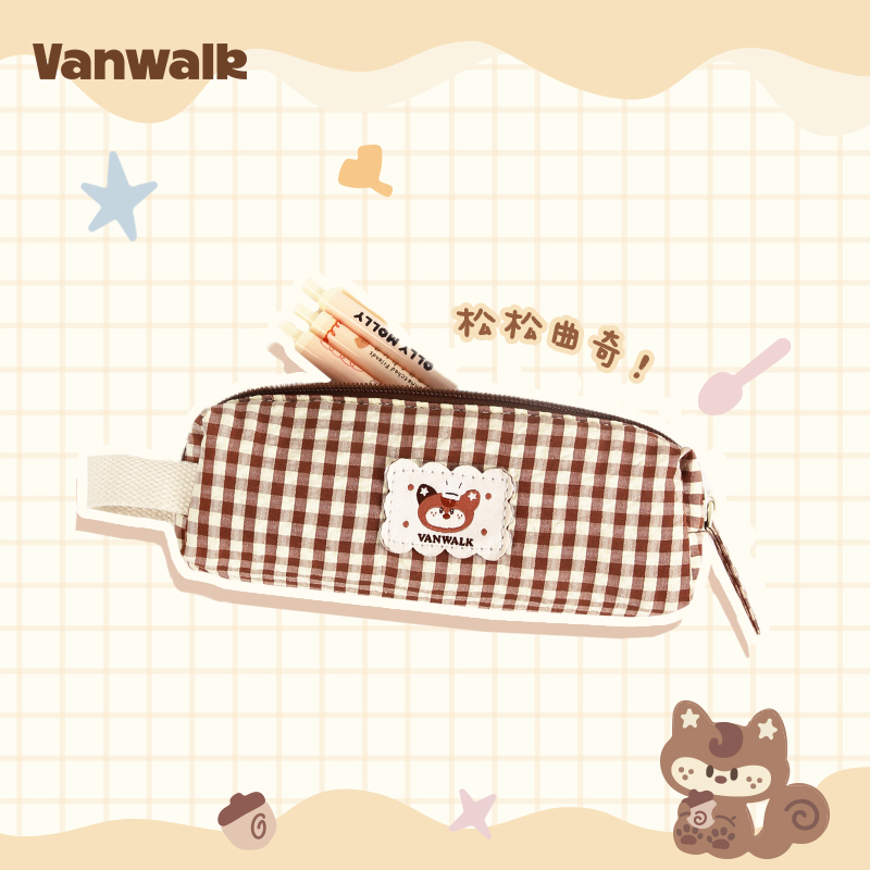 VANWALK松果部落 简约可爱动物创意ins风刺绣日系格子笔袋高颜值高中初中女生学生拉链文具盒铅笔盒收纳袋