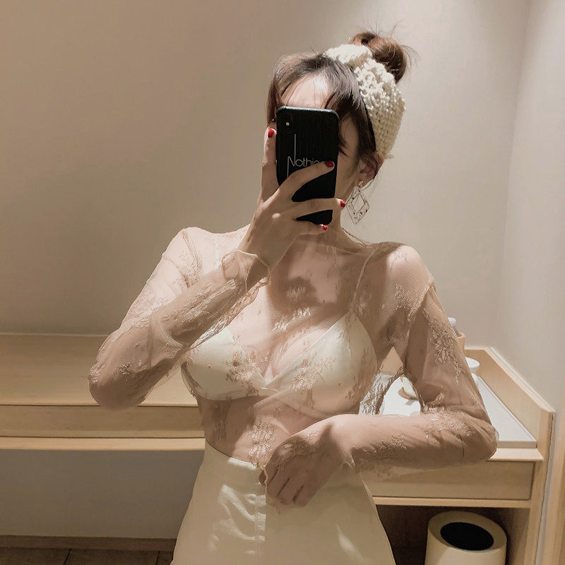 蕾丝打底衫女长袖2021高领春装内搭镂空雪纺洋气性感网纱百搭上衣