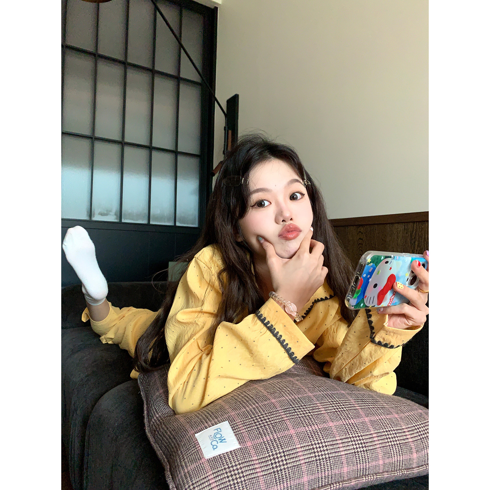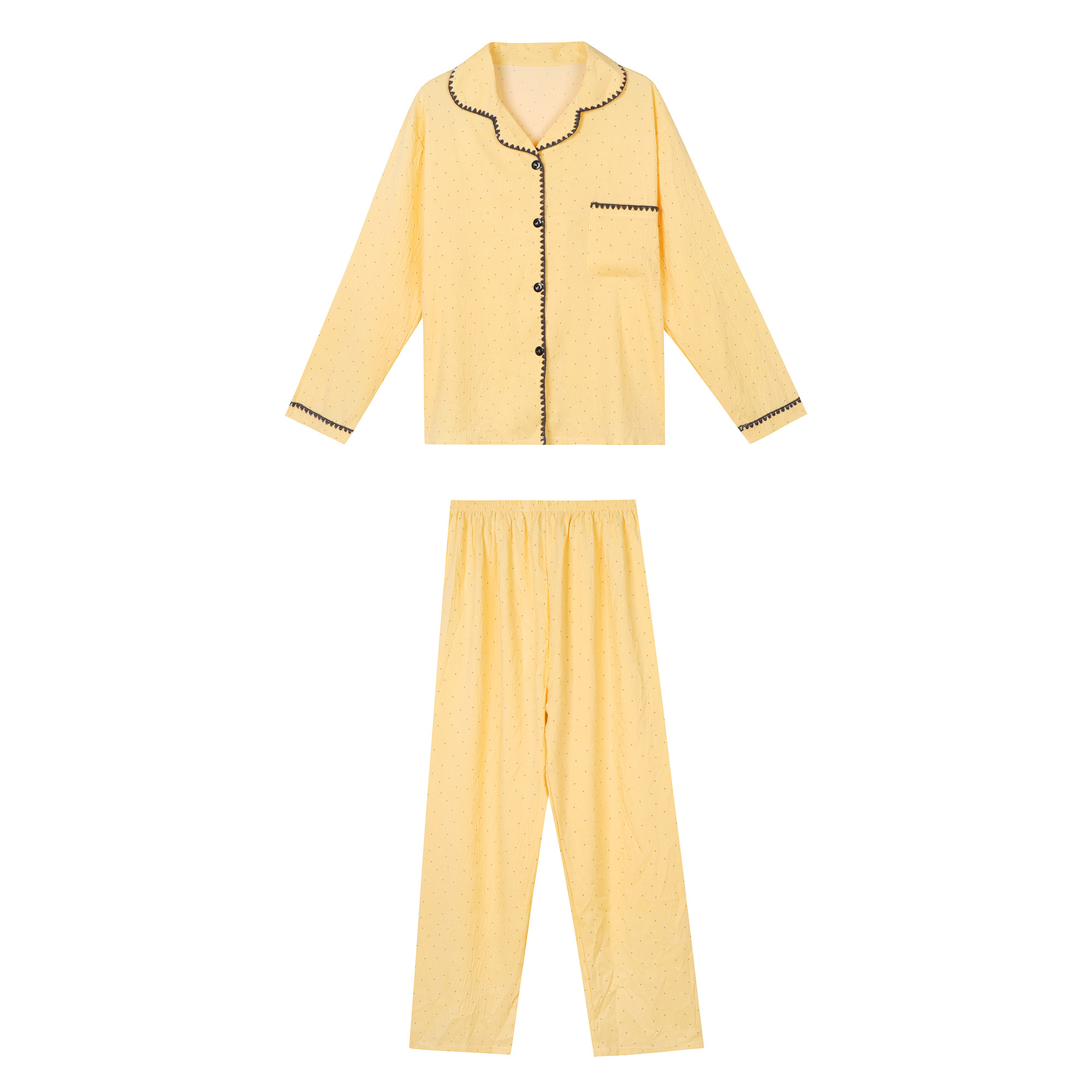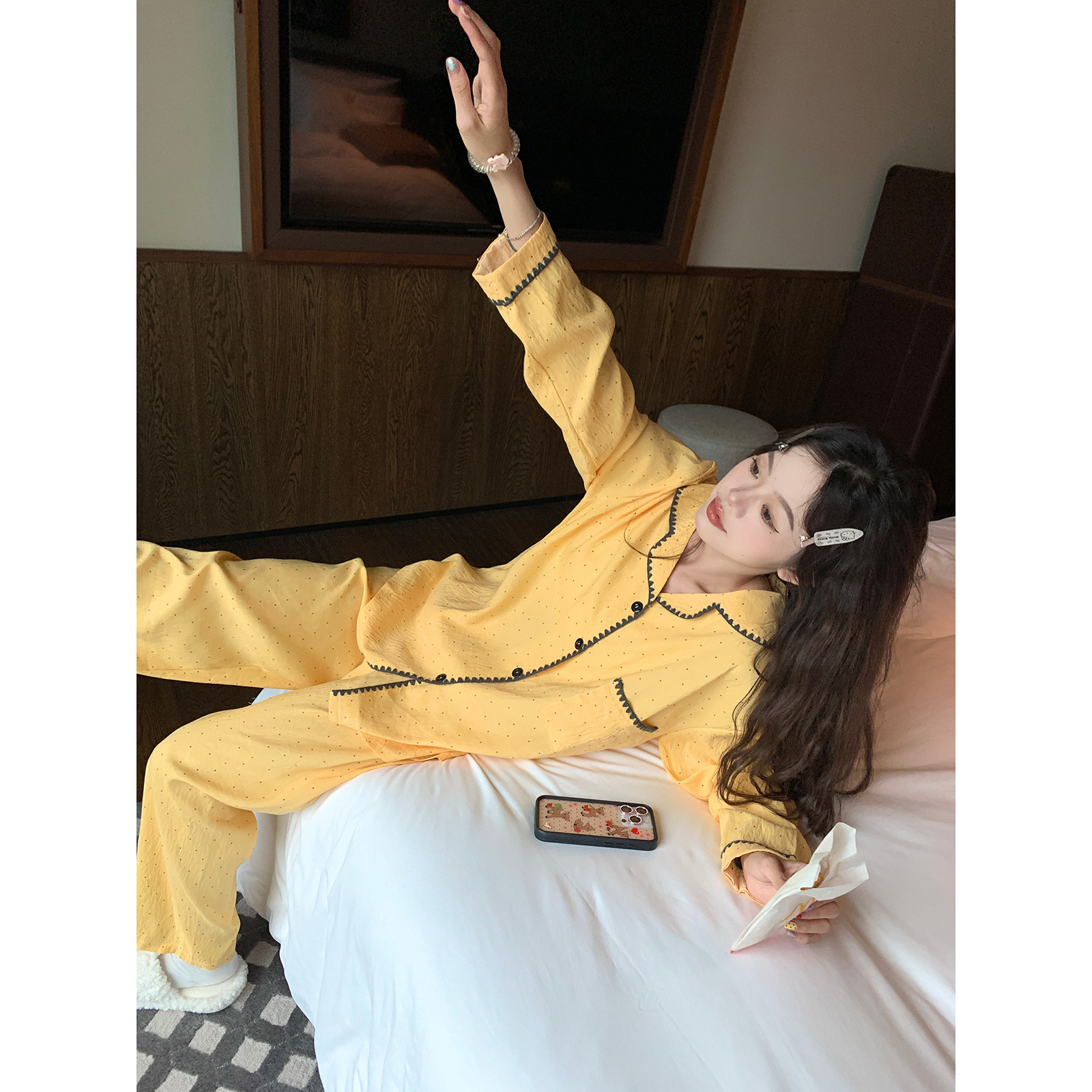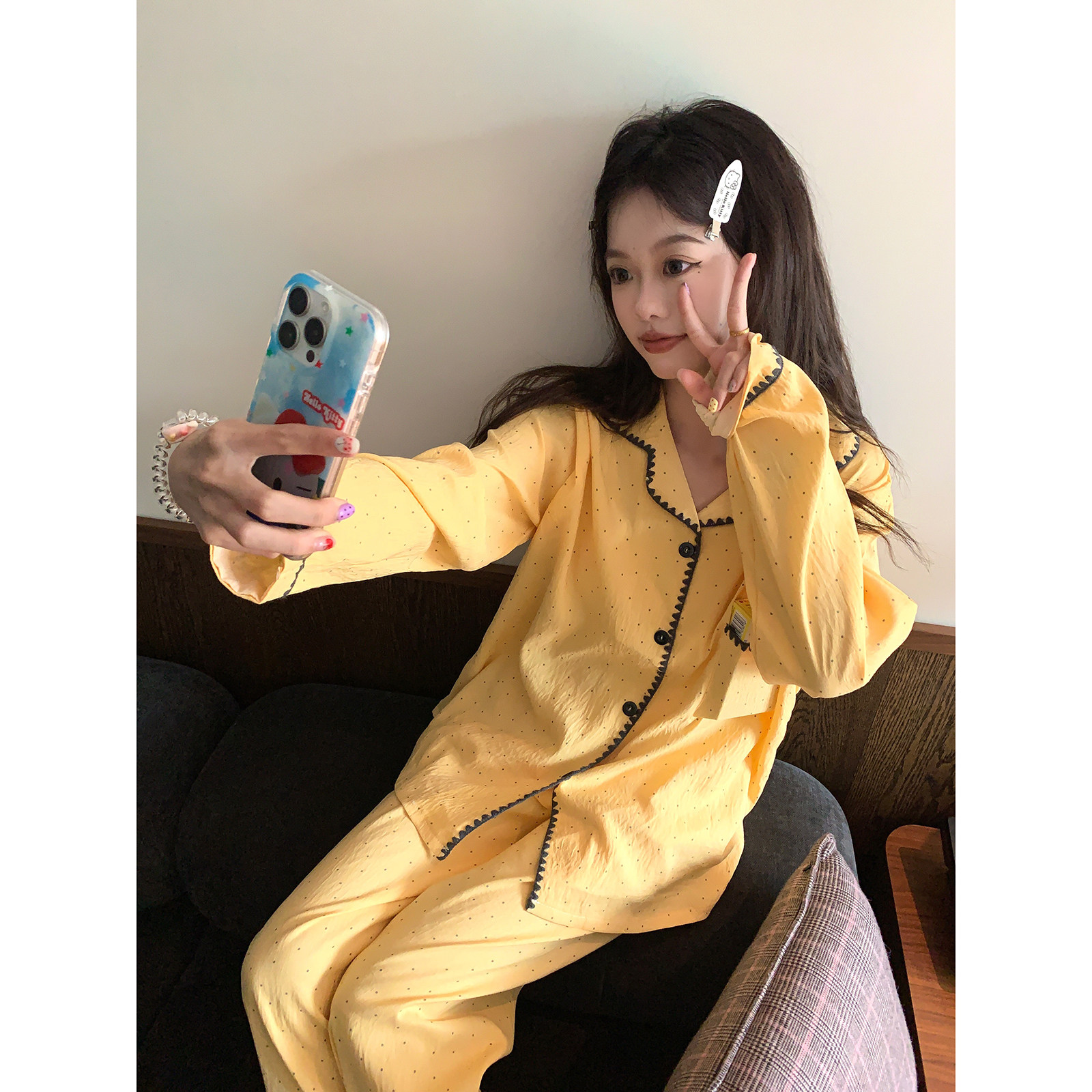 馨帮帮Homedress 撞色波点长袖睡衣女秋季宽松翻领外穿家居服套装