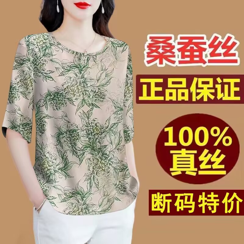 香云纱真丝短袖上衣女夏季妈妈宽松大码显瘦印花绸缎桑蚕丝T恤衫