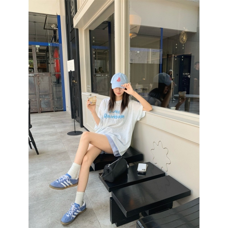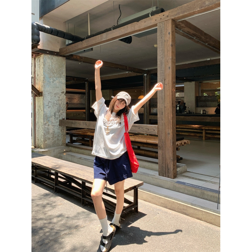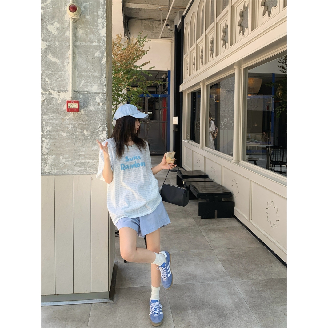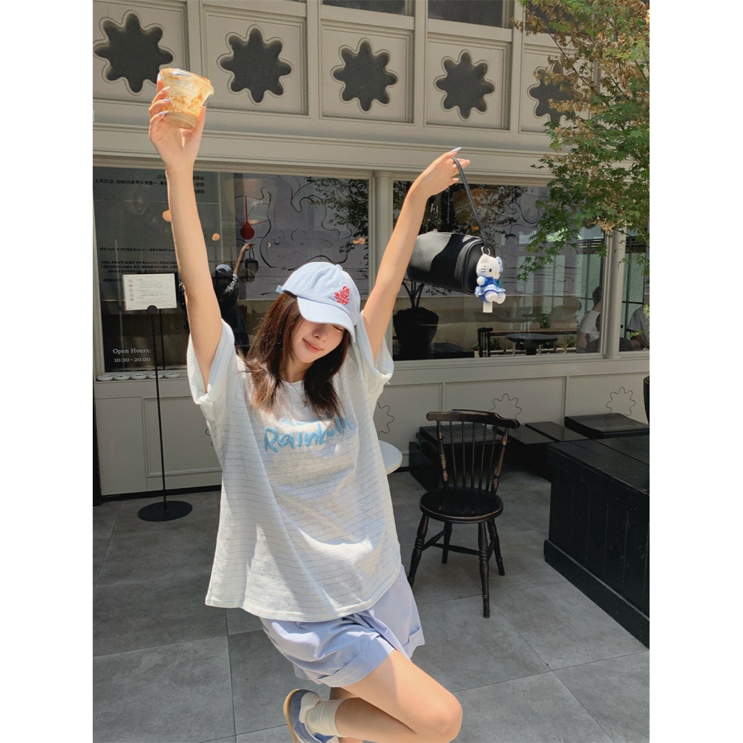 韩系条纹短袖T恤女2025夏季新款字母印花小个子宽松学生圆领上衣