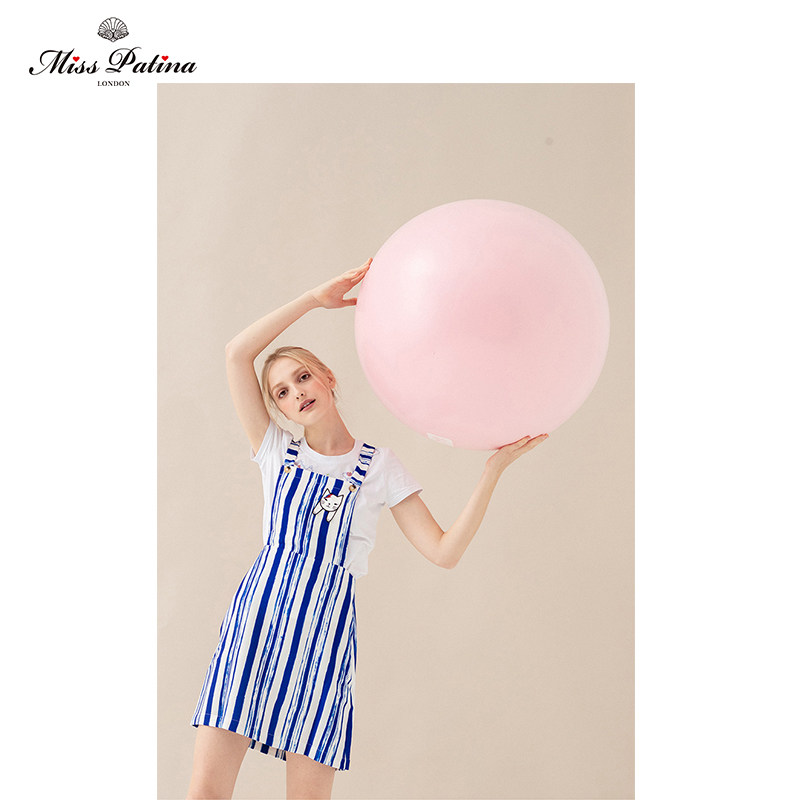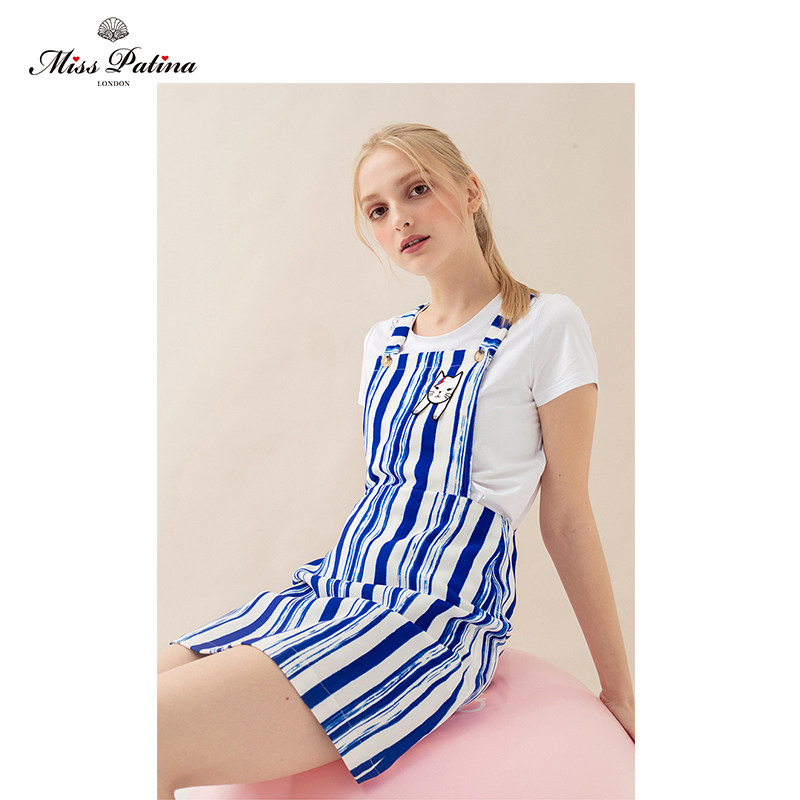MP英伦复古原创设计 闪电猫刺绣系列文艺海洋风竖条纹百搭背带裙