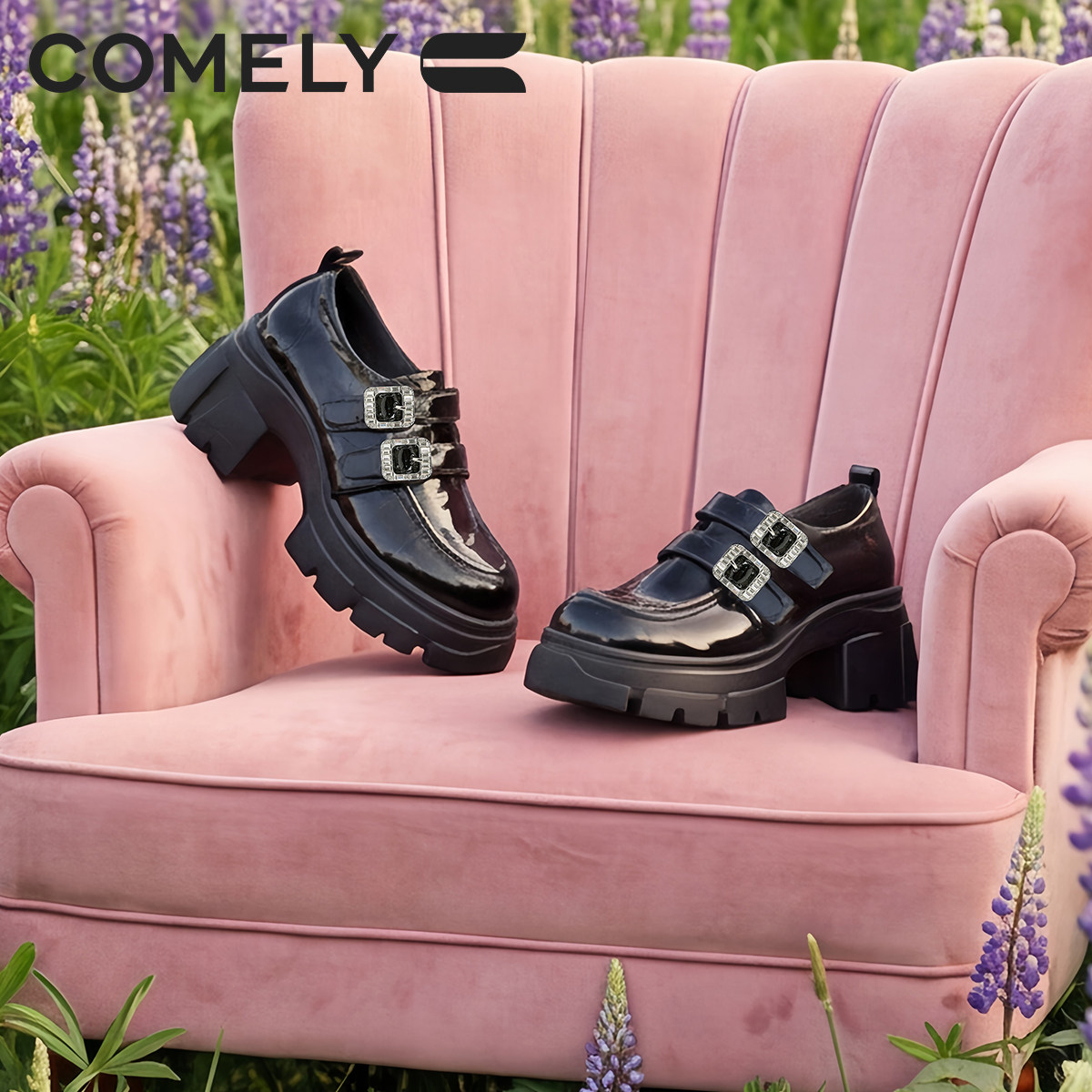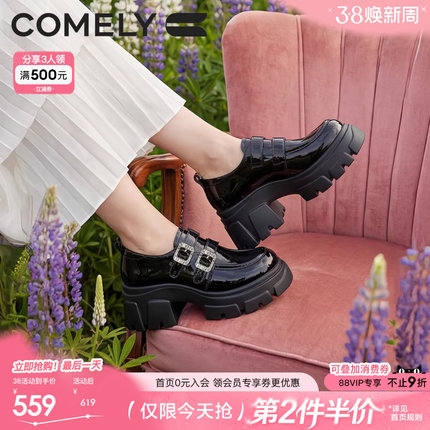 康莉英伦风厚底乐福鞋女2026春新款黑色漆皮双扣带小皮鞋商场同款