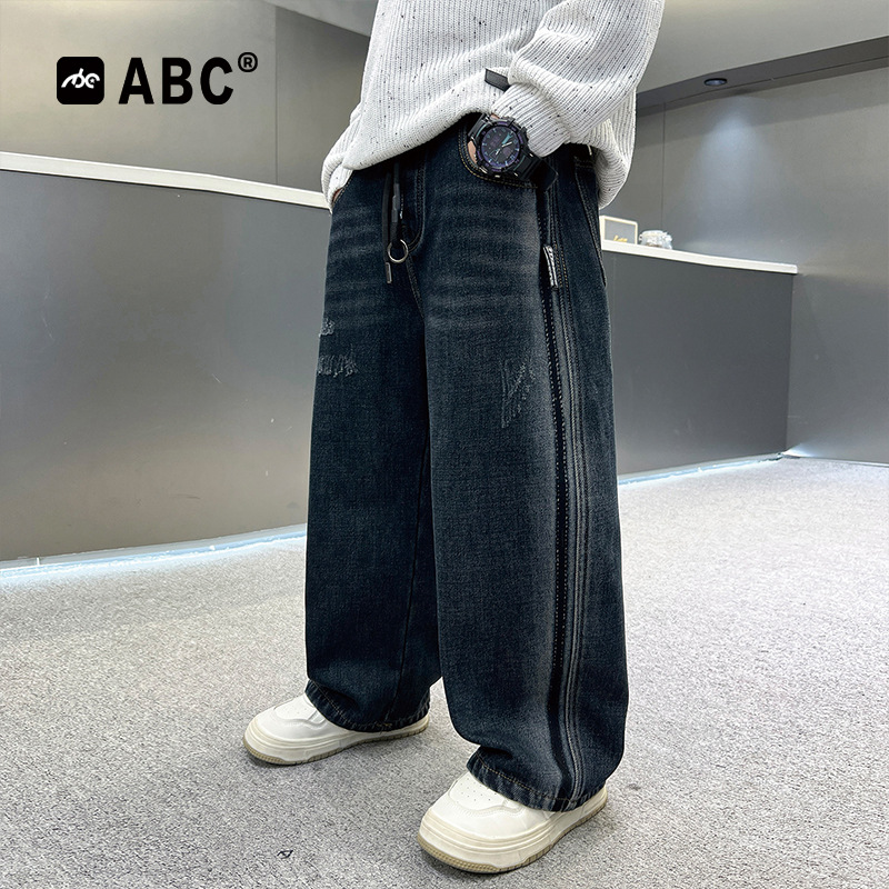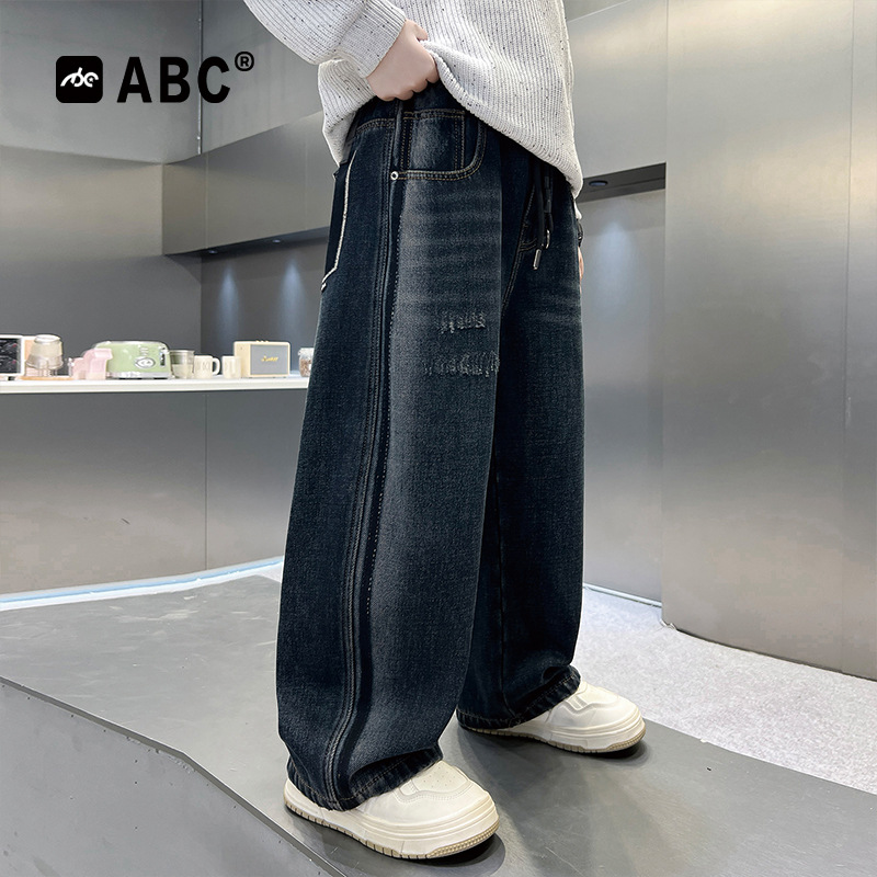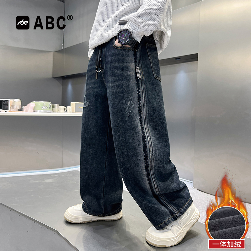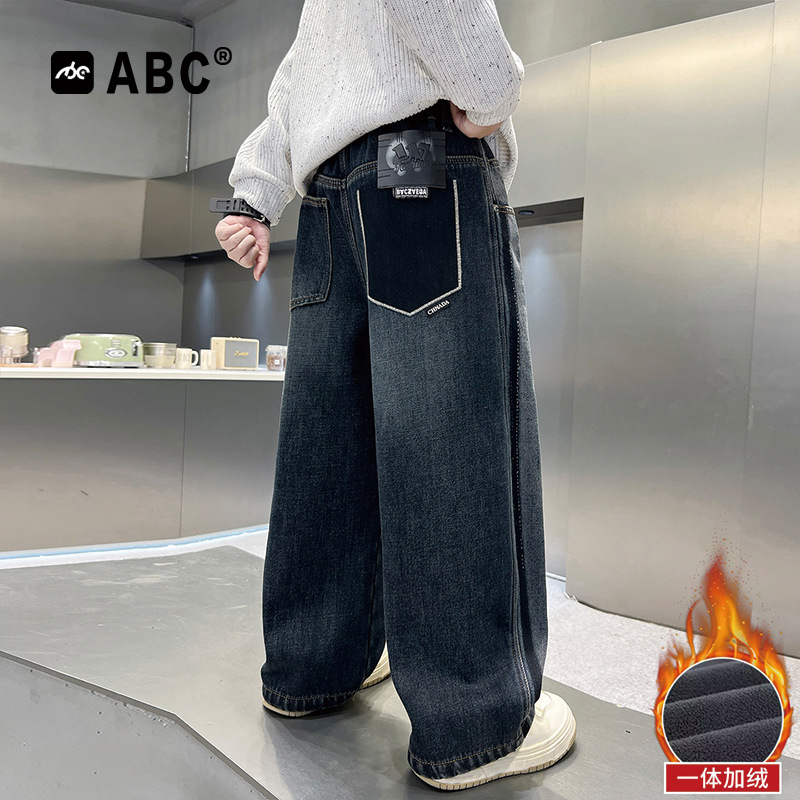 ABC男童秋冬款牛仔裤2025新款中大童加厚直筒裤男孩一体绒阔腿裤
