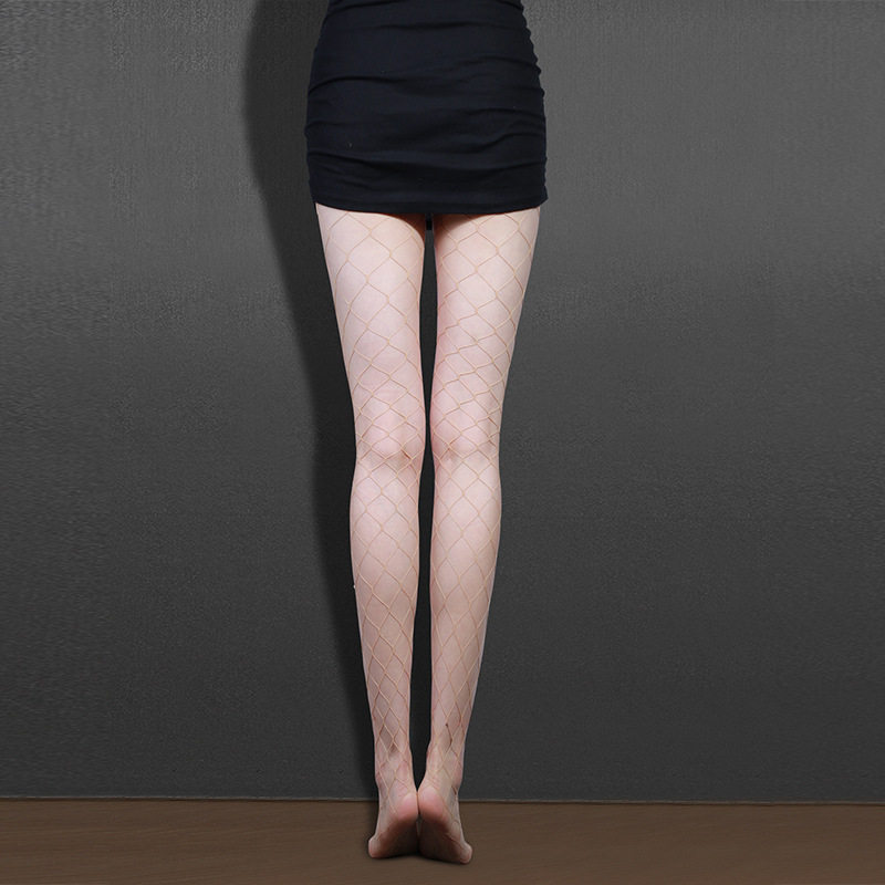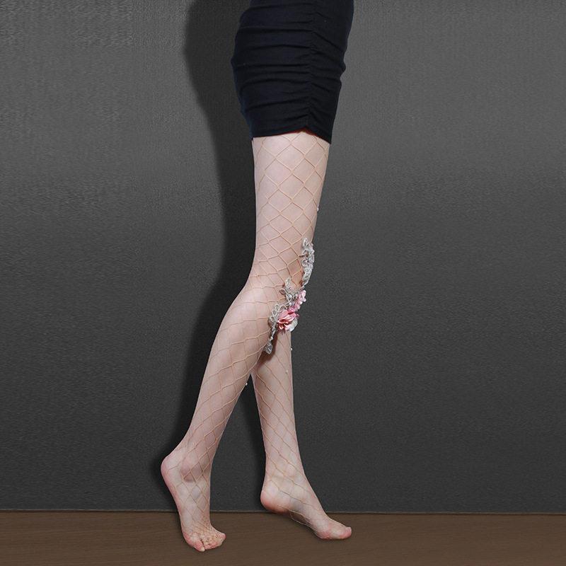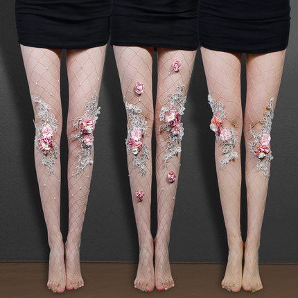 欧美新款烫钻大网花朵珍珠肤色刺绣装饰大花女士连裤大网格网袜
