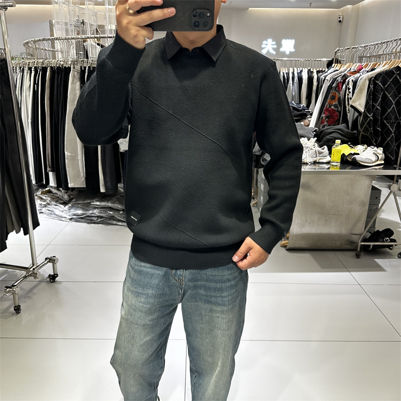 2025秋冬新款男士衬衫领针织衫弹力修身亲肤保暖拼接假两件毛衣