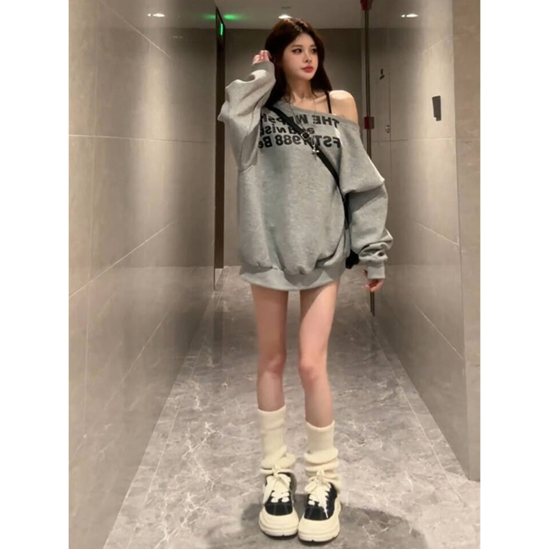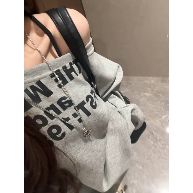 美式慵懒风字母斜肩长袖卫衣女春秋灰色小众宽松显瘦露肩上衣秋冬