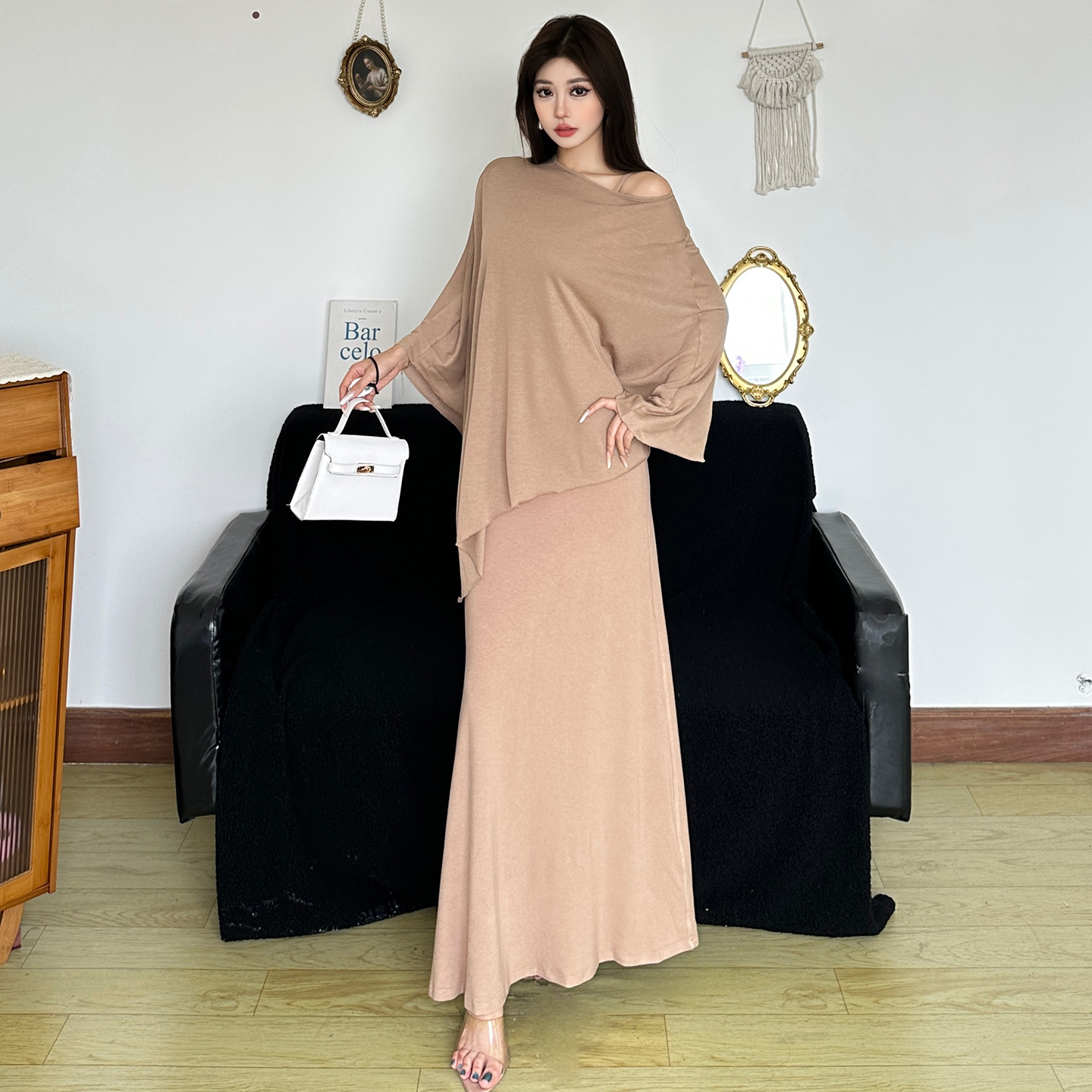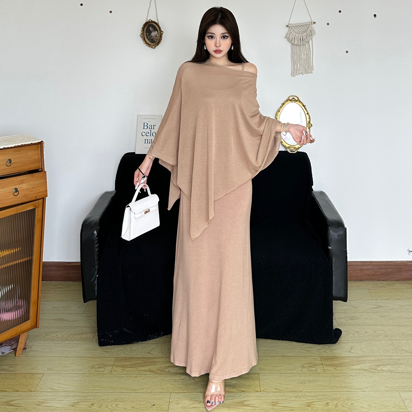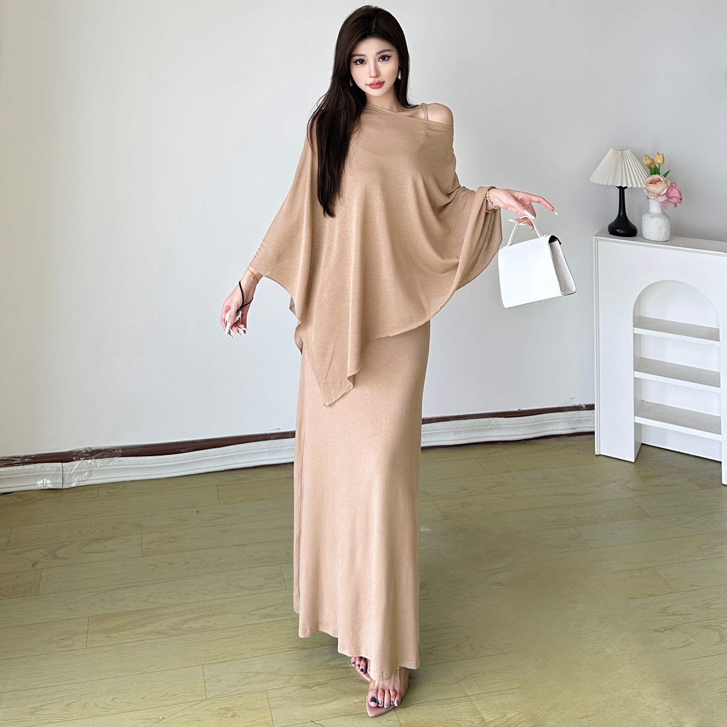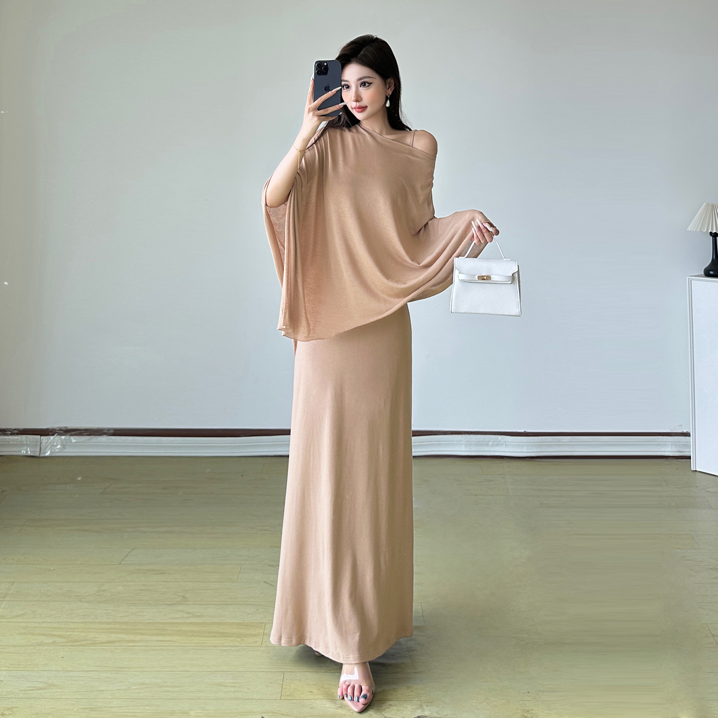 IAEY高智老钱风斜肩长袖宽松罩衫披肩修身包臀吊带连衣裙气质长裙