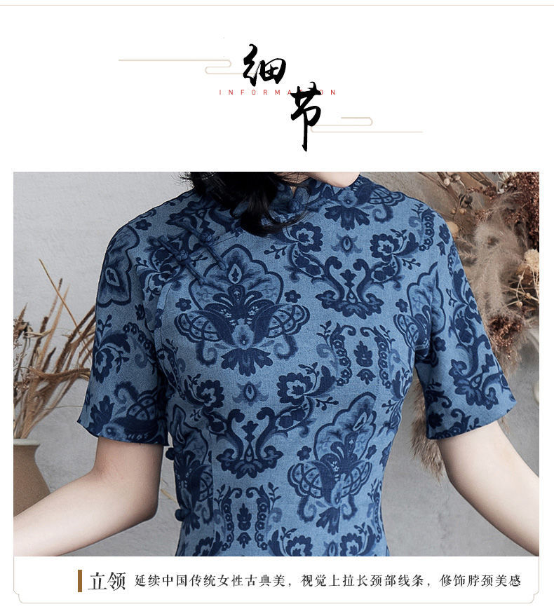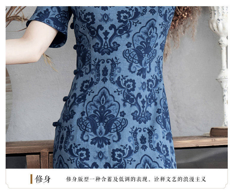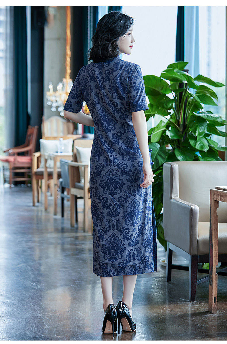 蓝色夏装日常复古优雅风长款旗袍