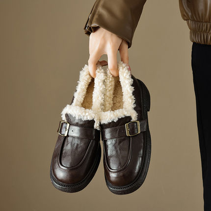 女士耐穿小皮鞋时尚2025秋冬新款圆头粗跟中跟加绒厚舒适深口单鞋