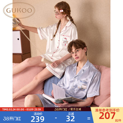 果壳情侣睡衣夏女士新款睡衣HelloKitty凉感冰丝男士家居服套装B