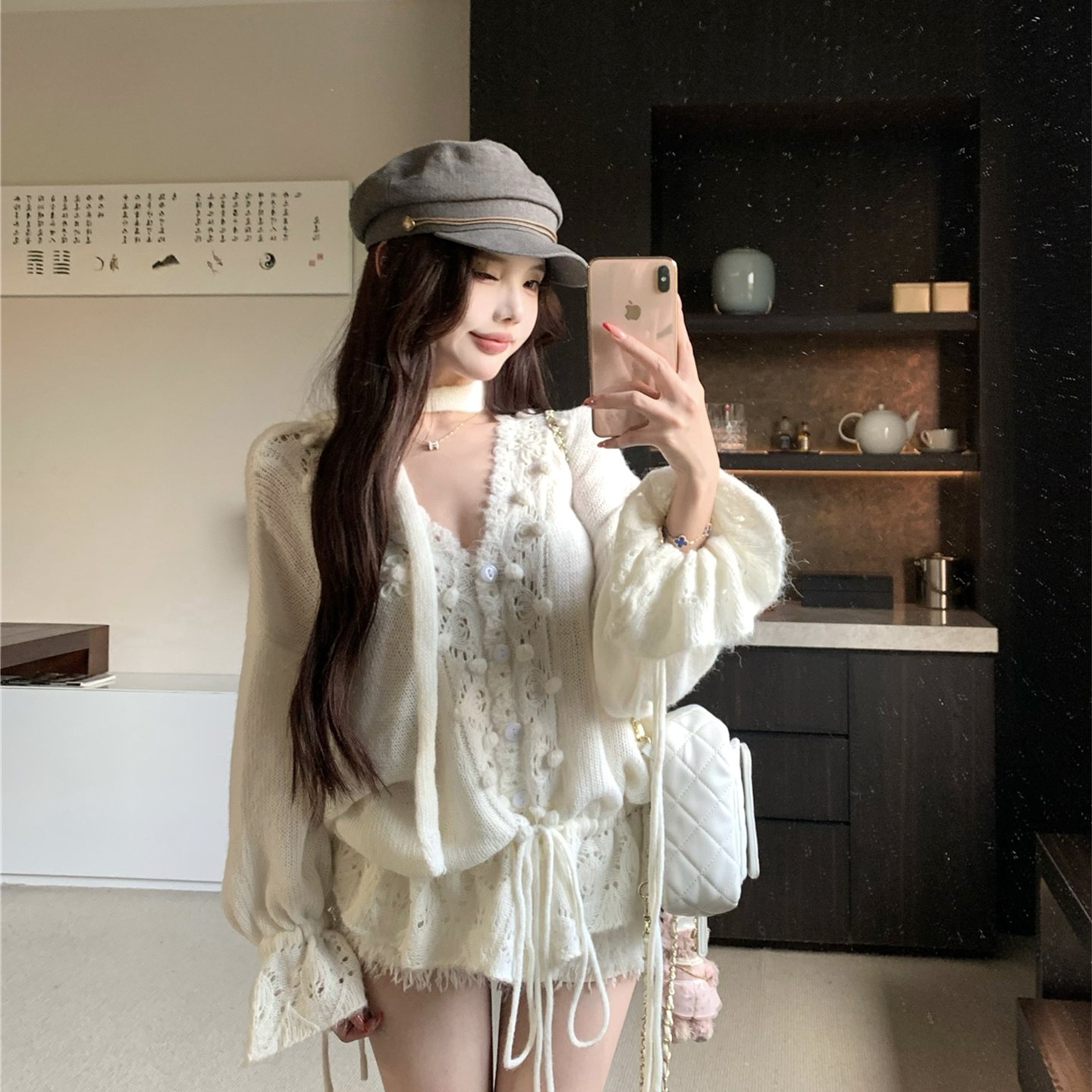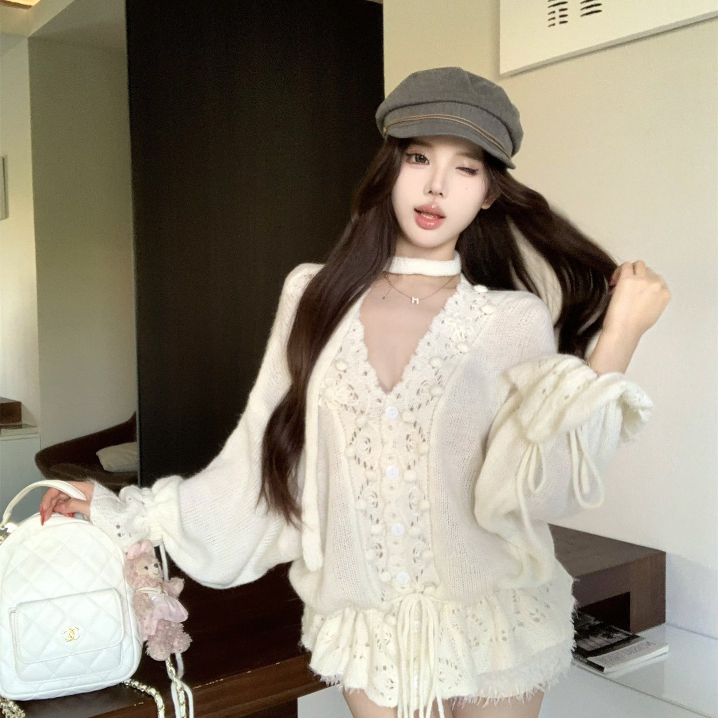 实拍~秋冬 绵绵奶芙法式温柔慵懒感v领镂空钩花抽绳毛衣针织开衫
