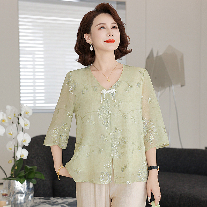新中式妈妈夏装衬衫洋气国风雪纺衫中老年气质遮肚上衣两件套装女