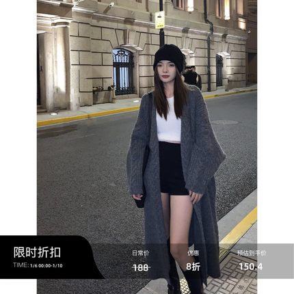 辰米范 灰色麻花中长款毛衣女开衫秋冬新款宽松加厚针织外套大衣