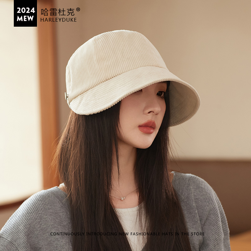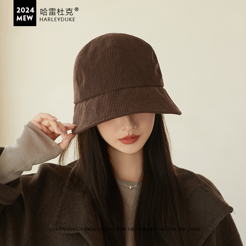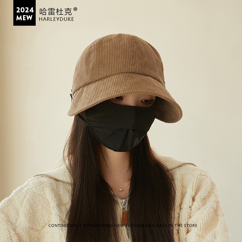 2024秋冬新款可戴口罩盆帽纯色简约灯芯绒鸭舌帽宽檐显脸小渔夫帽