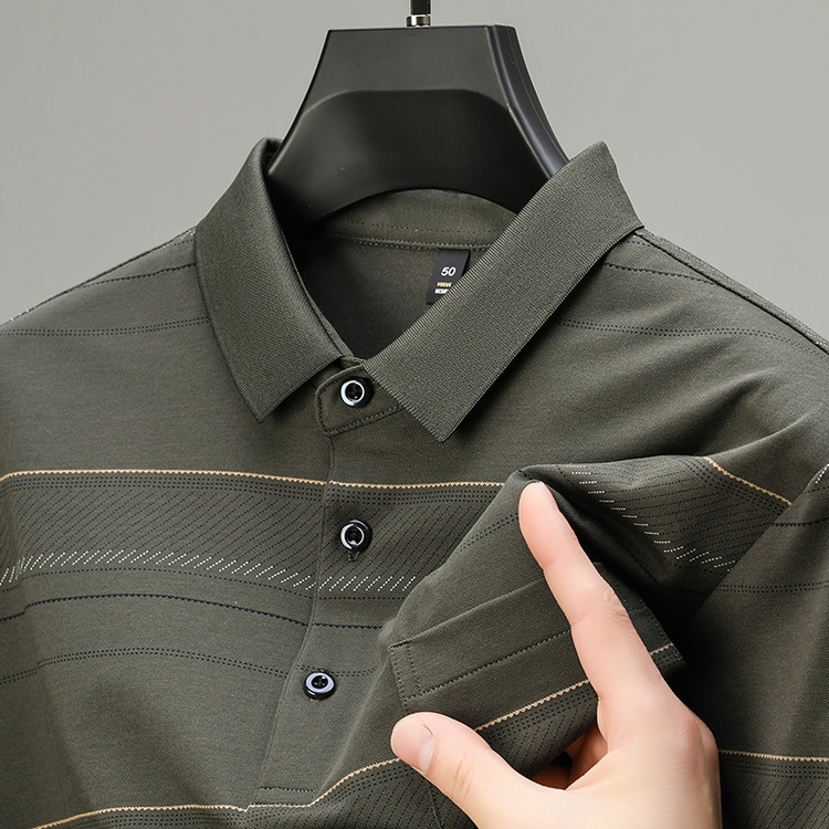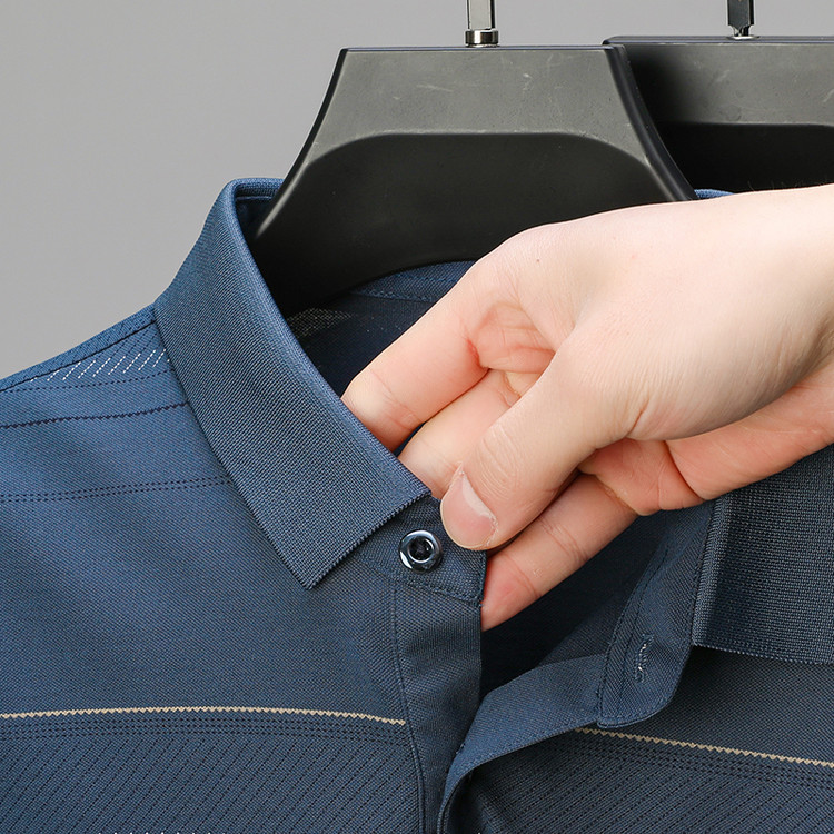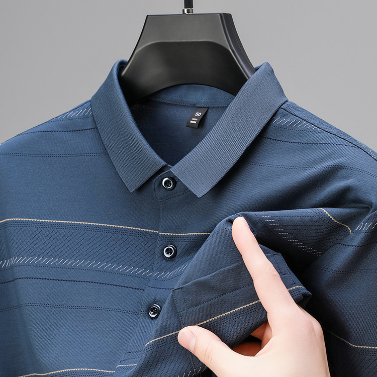夏季新款冰丝短袖t恤男士翻领条纹中年爸爸宽松polo衫休闲上衣潮