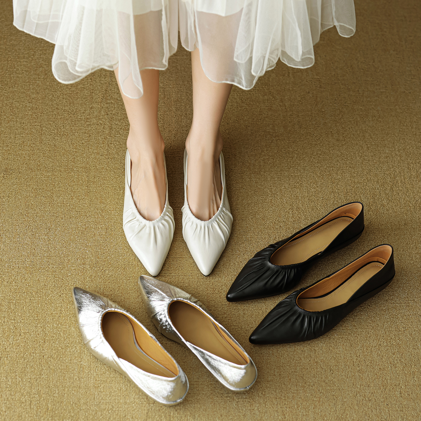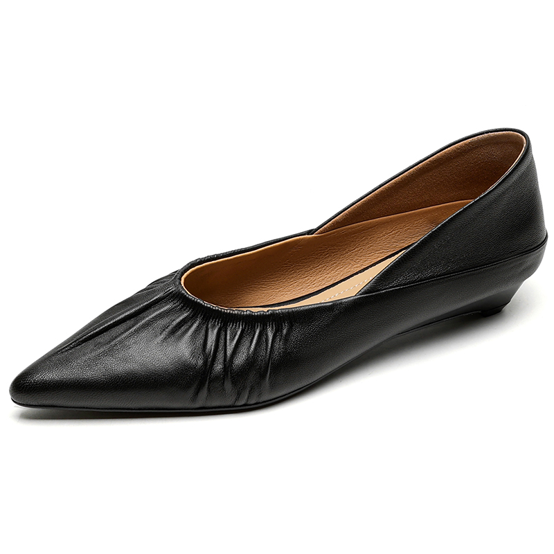 头层羊皮小众设计褶皱尖头单鞋女真皮粗跟中跟内增高软面奶奶女鞋