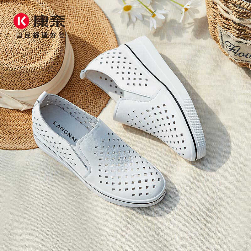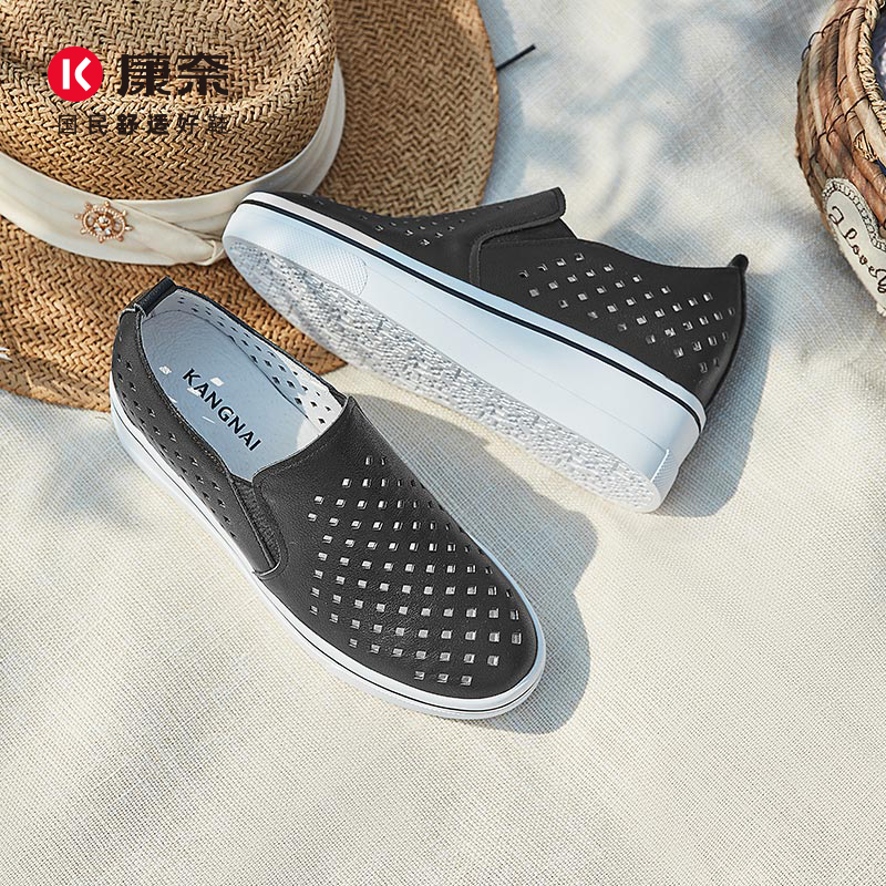 康奈官方女鞋内增高小白鞋春夏季新品真皮透气冲孔鞋舒适厚底板鞋