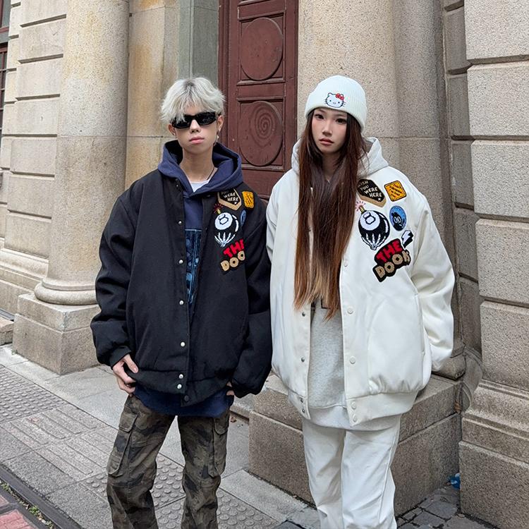 126KID 美式高街徽章字母刺绣棒球服男女冬季夹棉棉衣夹克外套