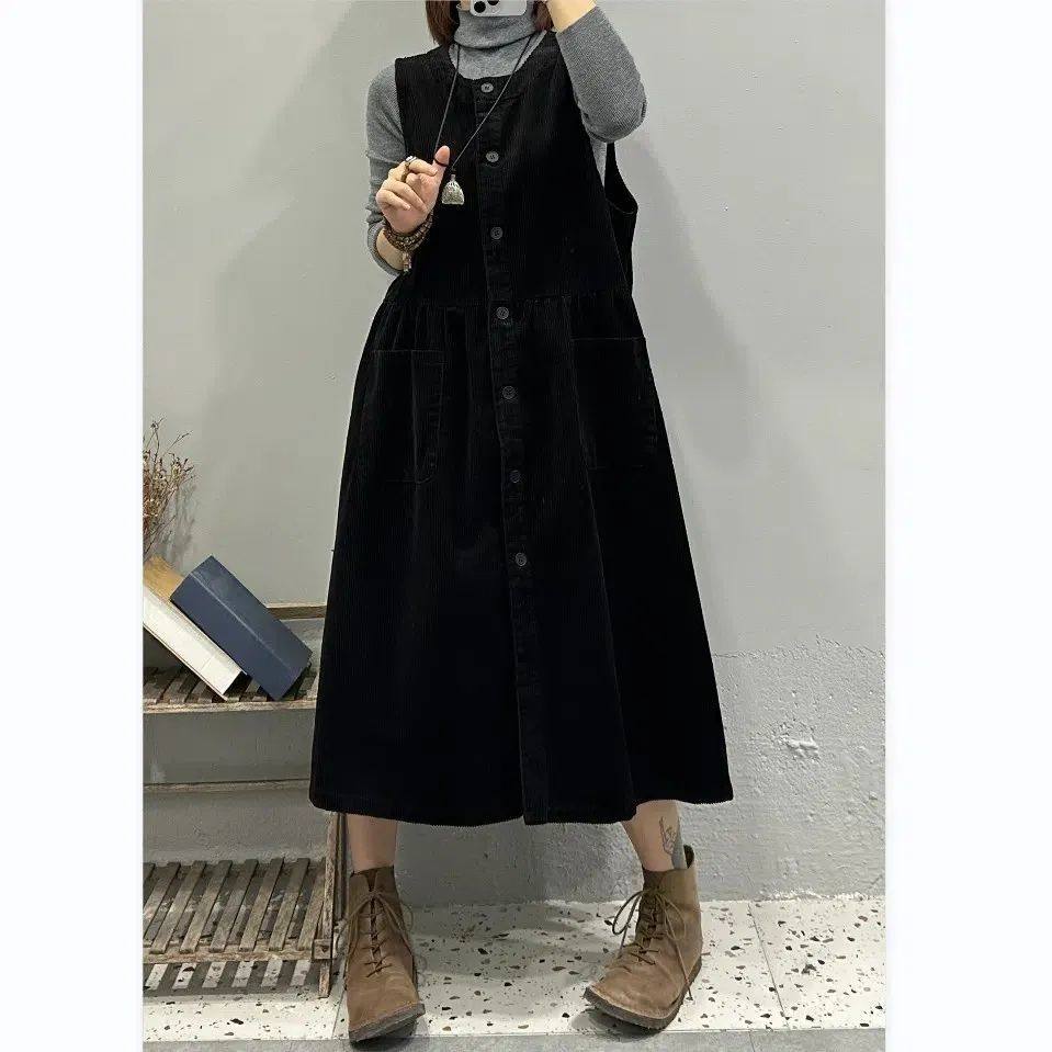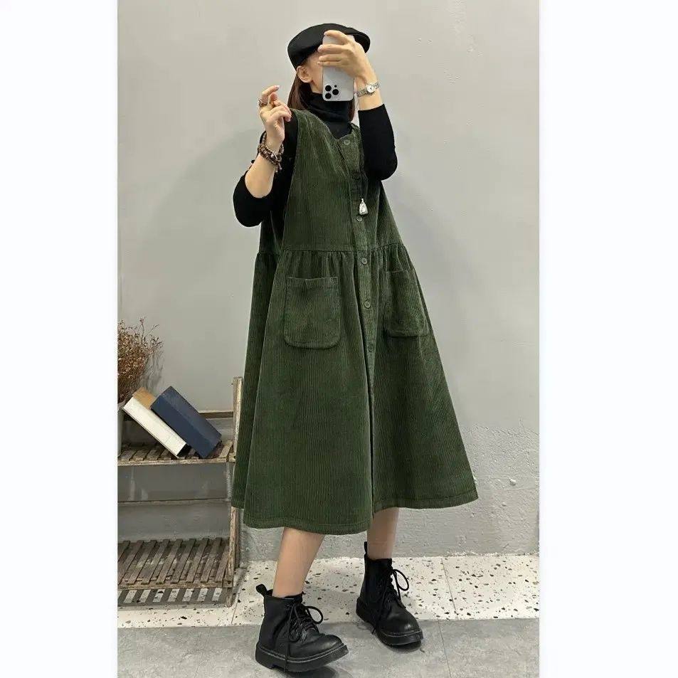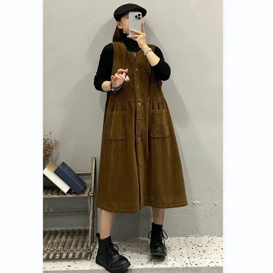 2025秋冬新款灯芯绒背带连衣裙女无袖宽松复古过膝中长款背带裙