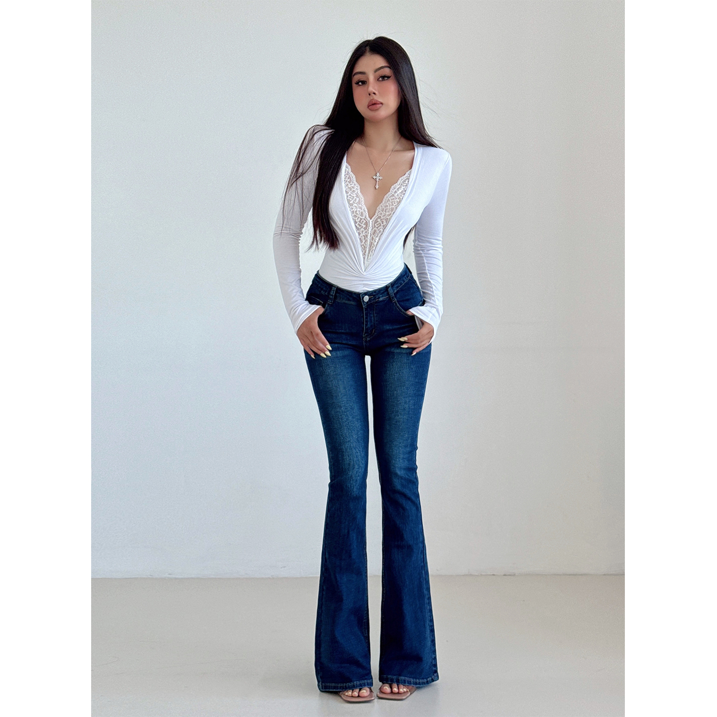 liviahome 美式复古黑色低腰微喇牛仔裤女弹力修身显瘦丰胯拖地裤