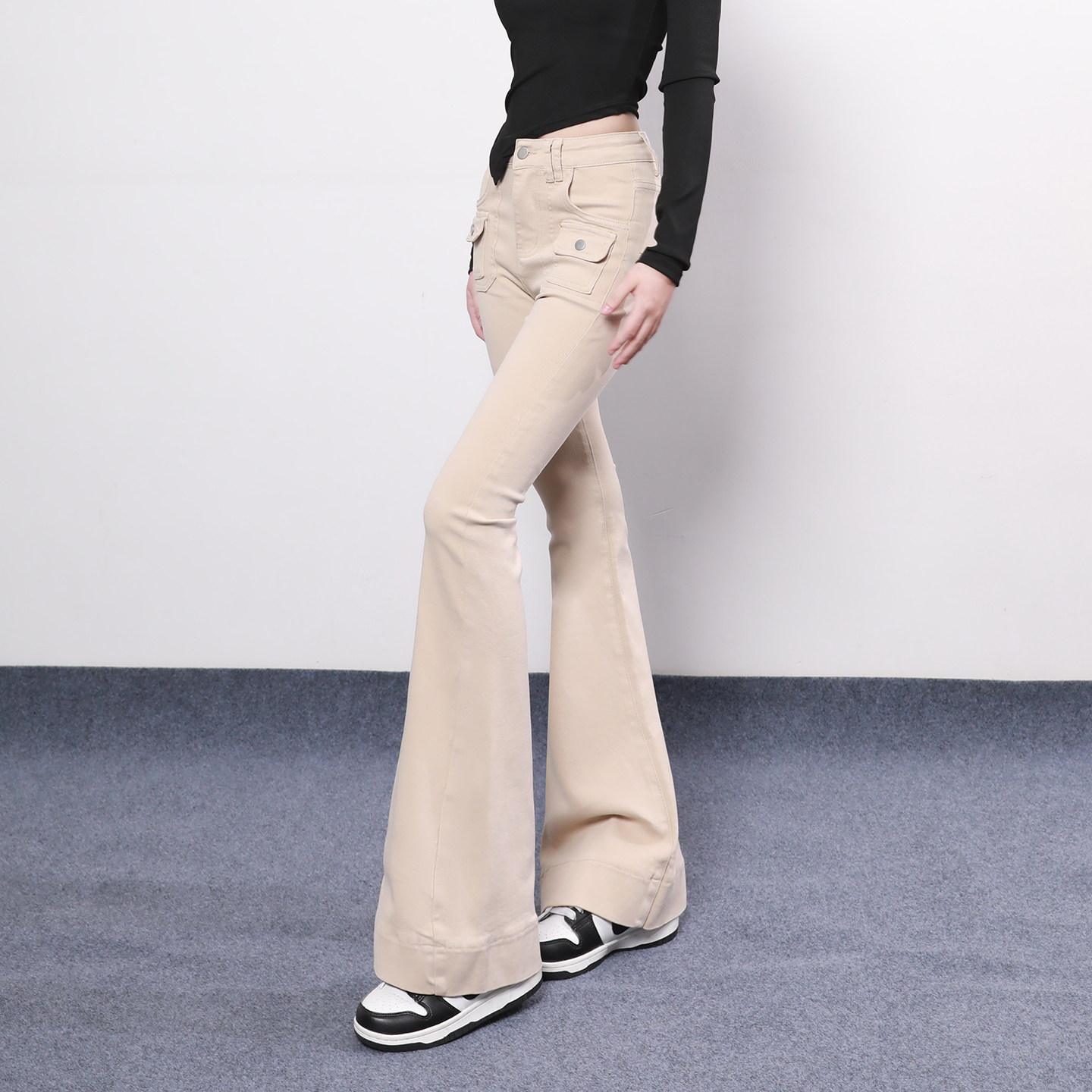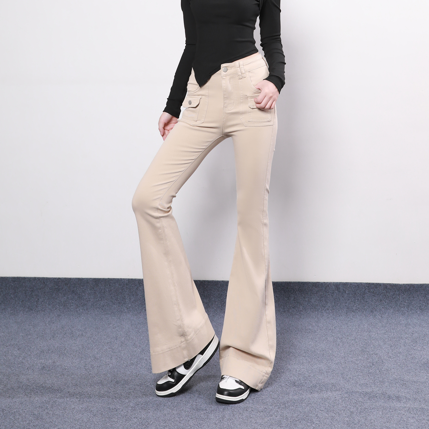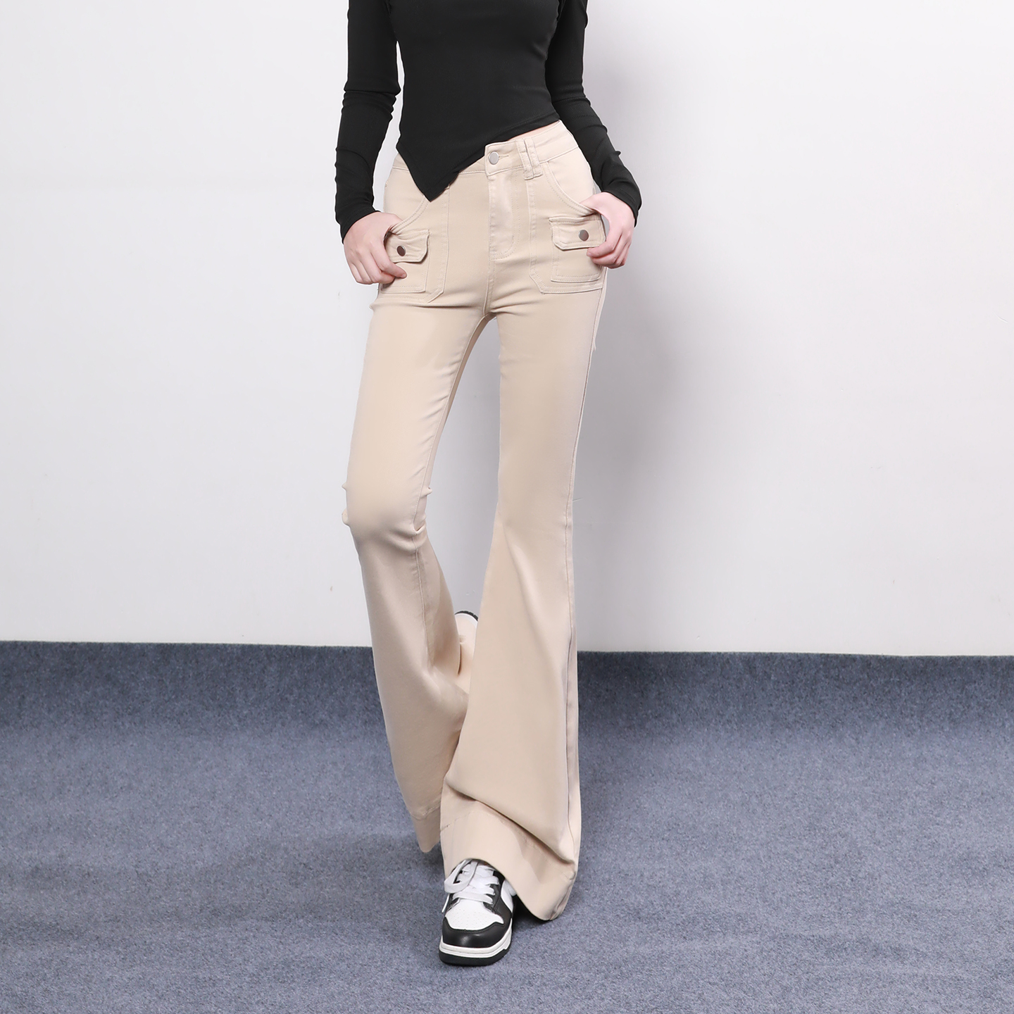 艾格气质复古杏色百搭喇叭裤高腰微喇牛仔裤女显瘦拖地长裤设计感