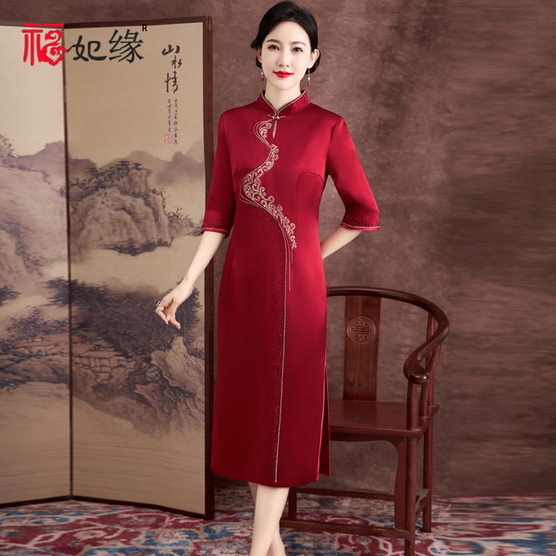 修身醋酸宴会婚礼服旗袍连衣裙妈妈喜婆婆婚宴旗袍装高端红色长款