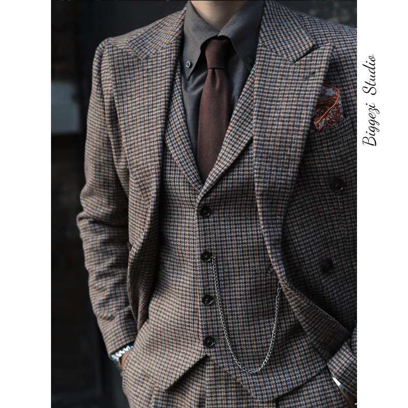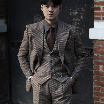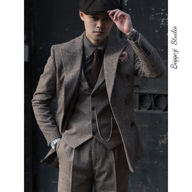复古英伦千鸟格子浴血黑帮风秋冬厚款呢子修身双排扣西服三件套装