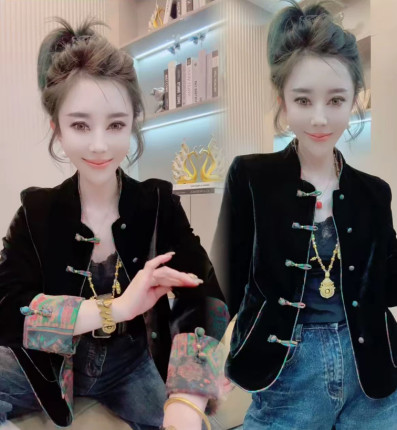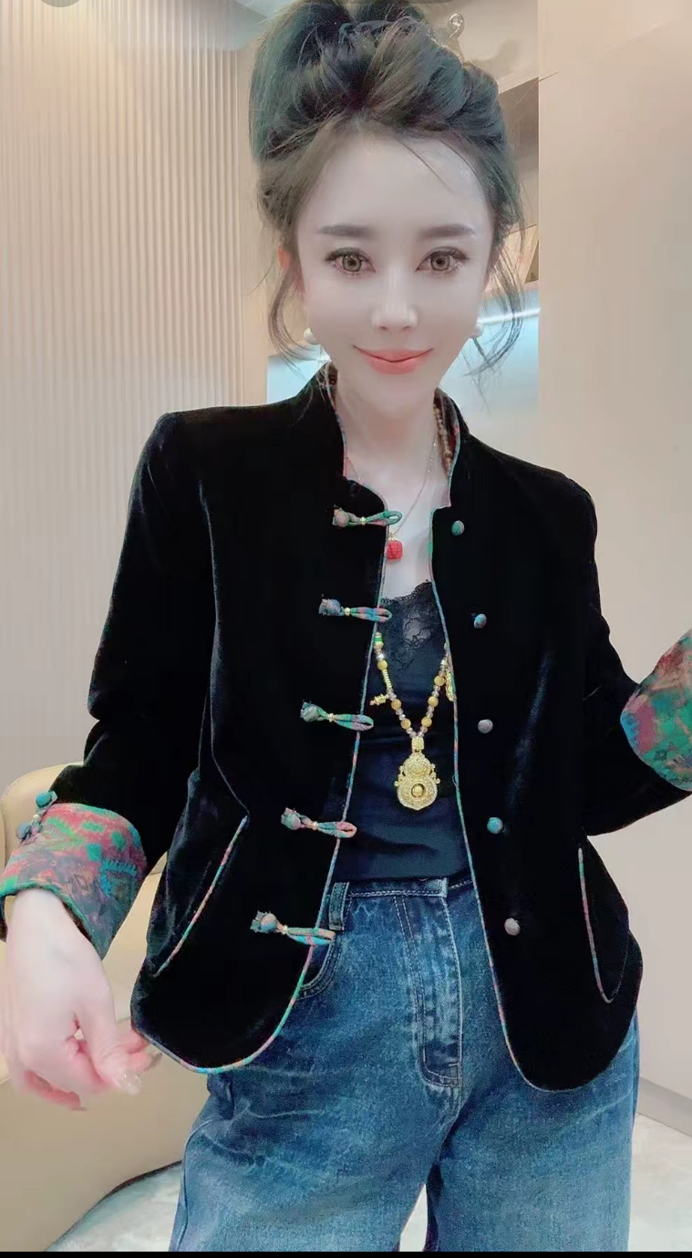 新中式国风盘扣真丝绒贡缎提花拼色宽松外套女2025秋复古唐装上衣