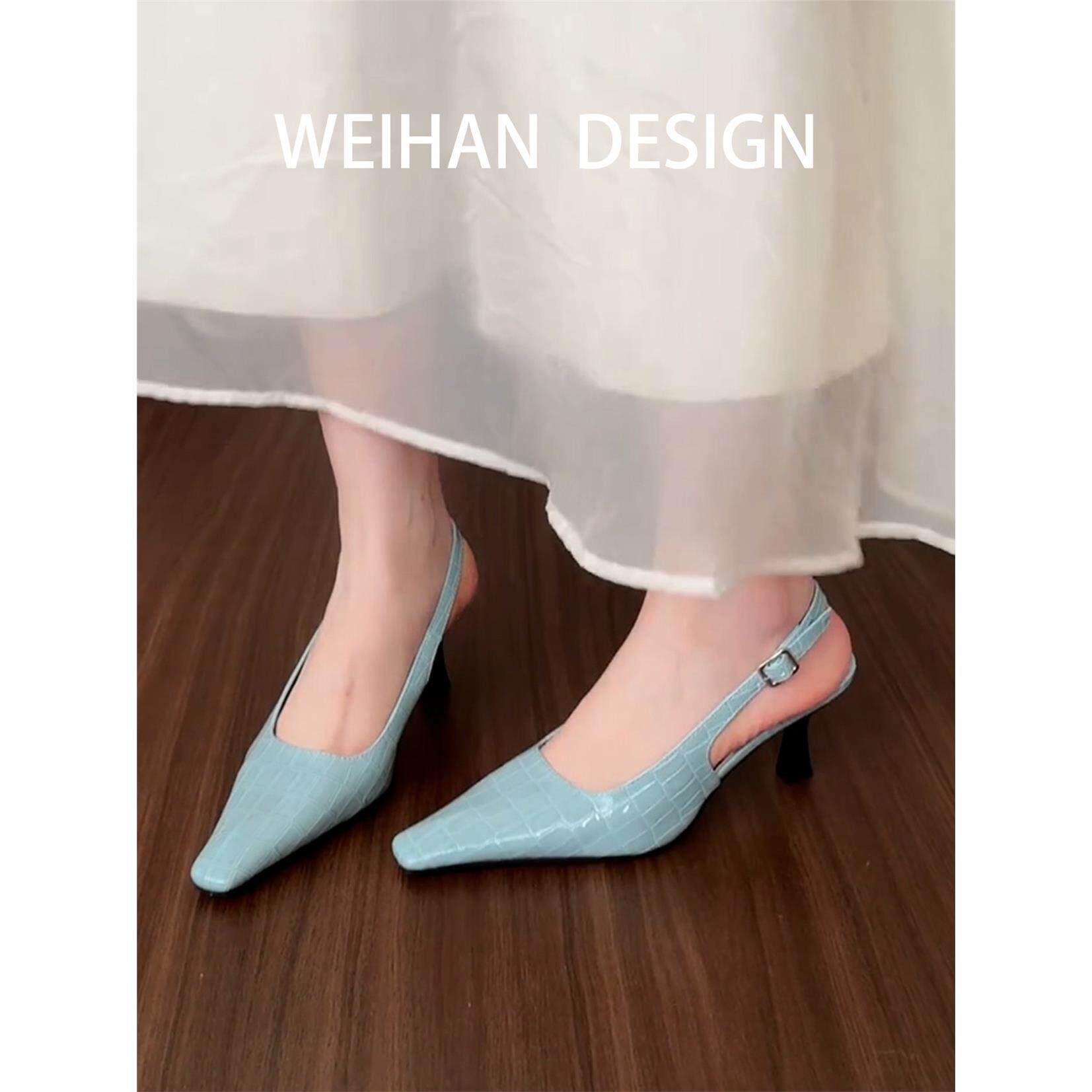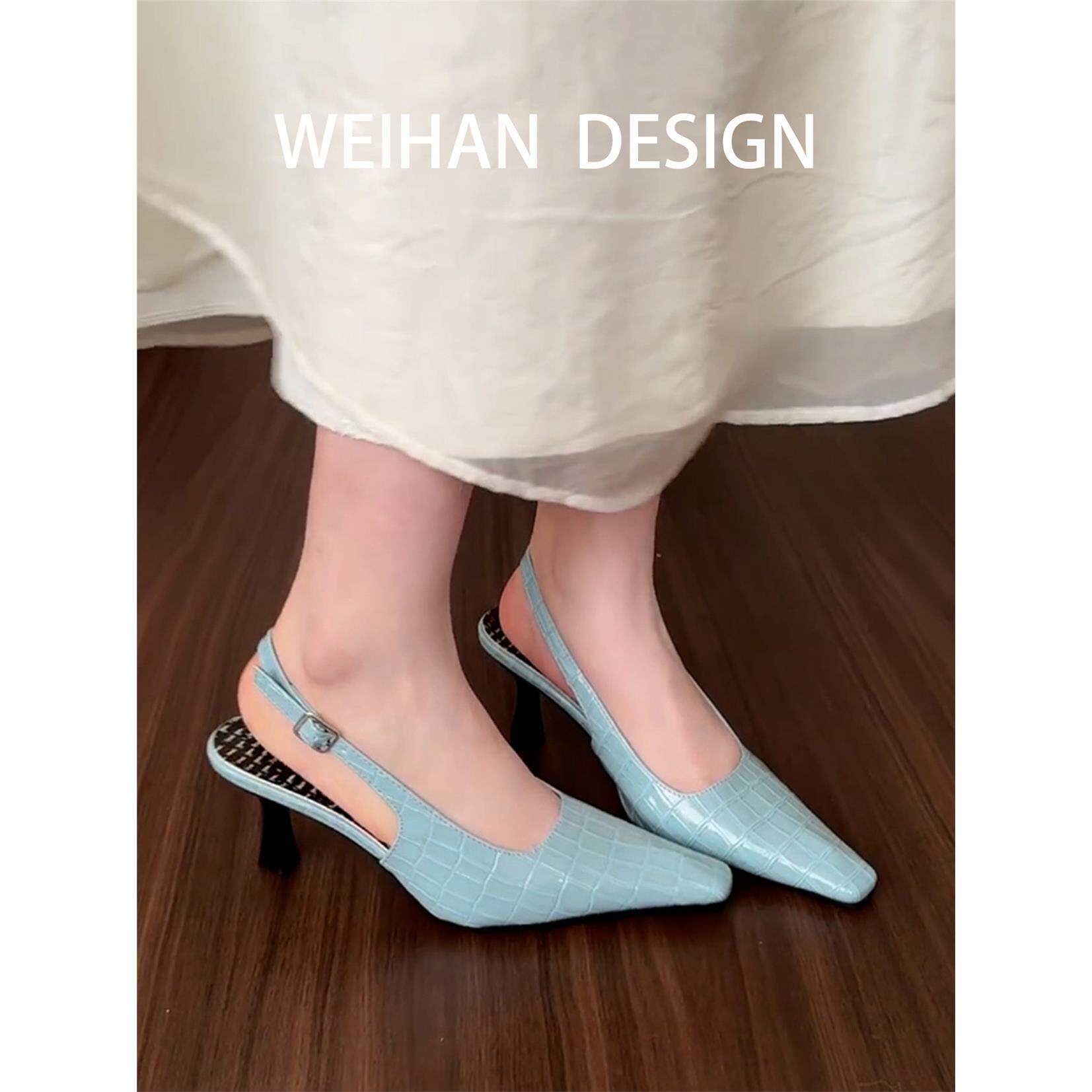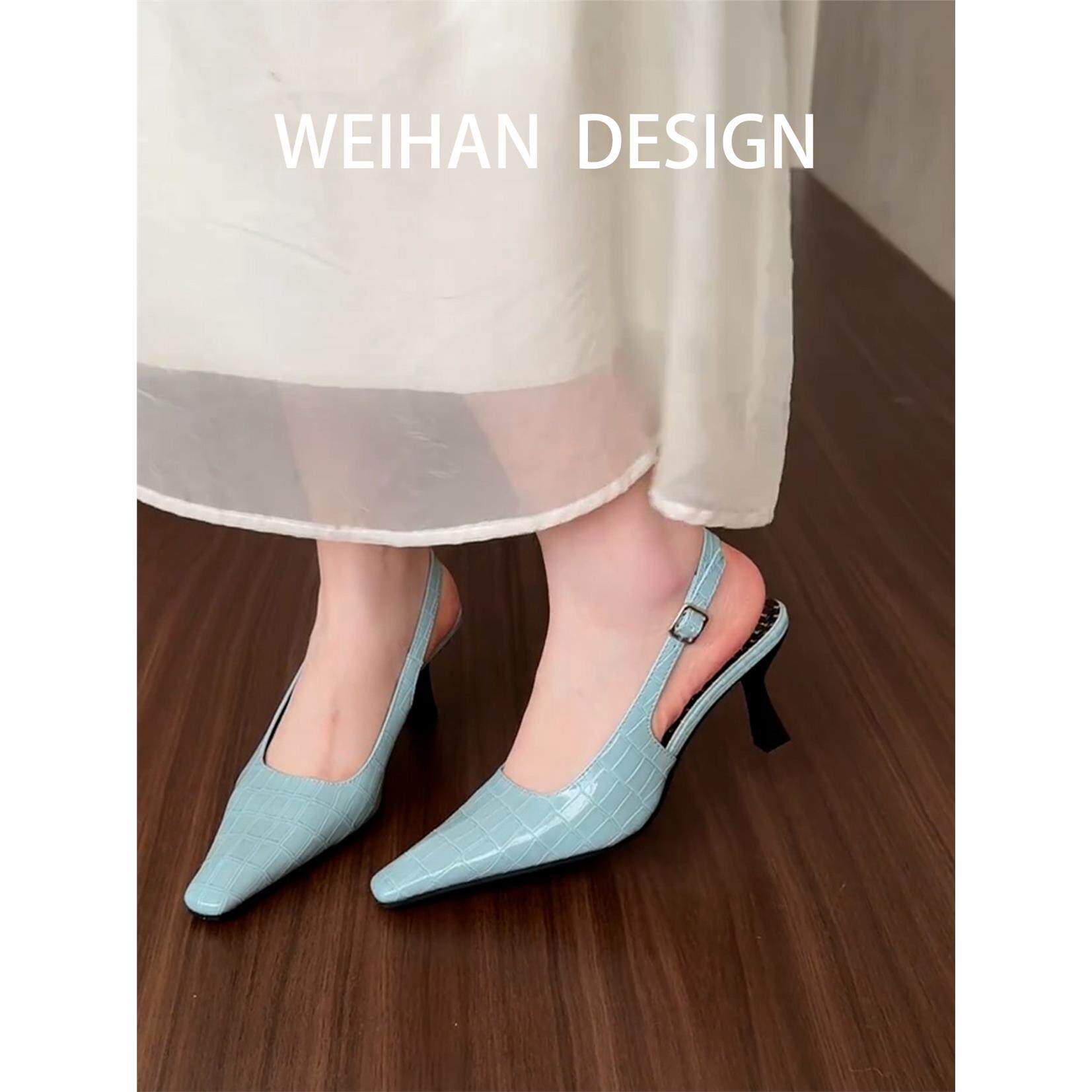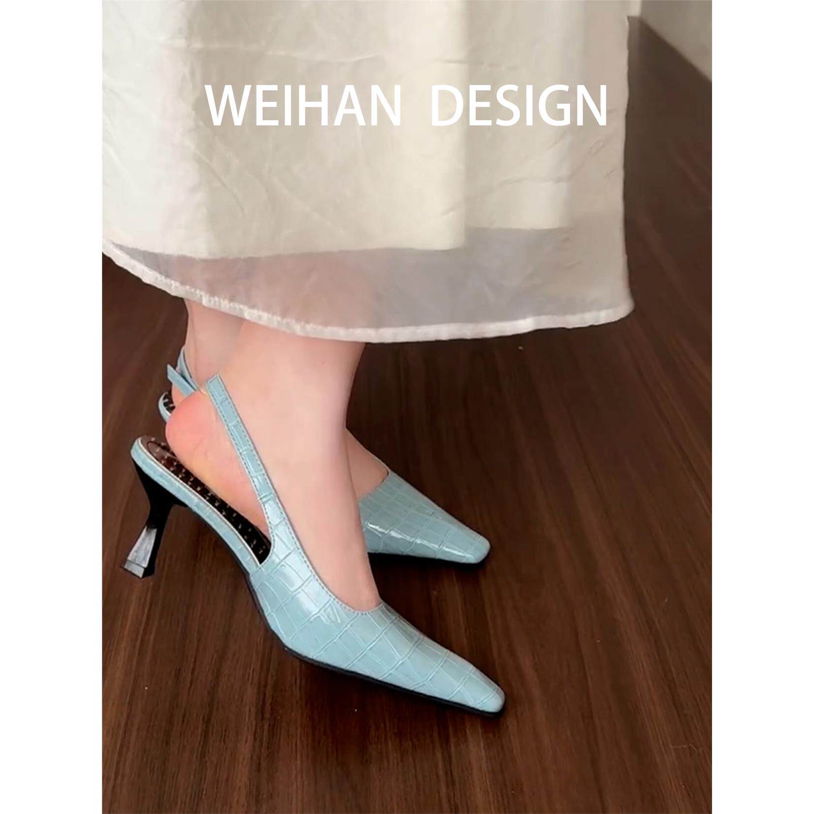 羊皮版!性感小方头细跟包头凉鞋女外穿春夏气质一字带后空高跟鞋