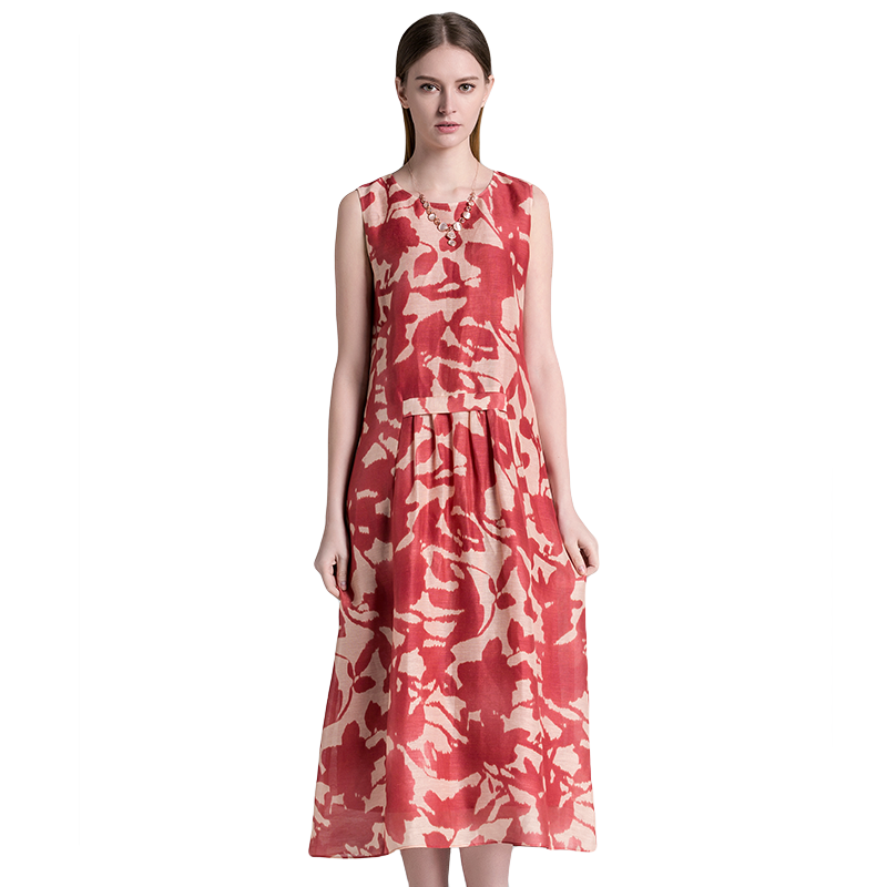 品牌2025夏季新款印花桑蚕丝亚麻无袖长款丝麻连衣裙女真丝长裙夏
