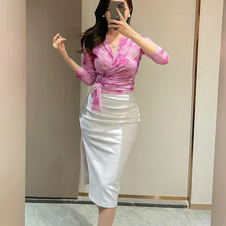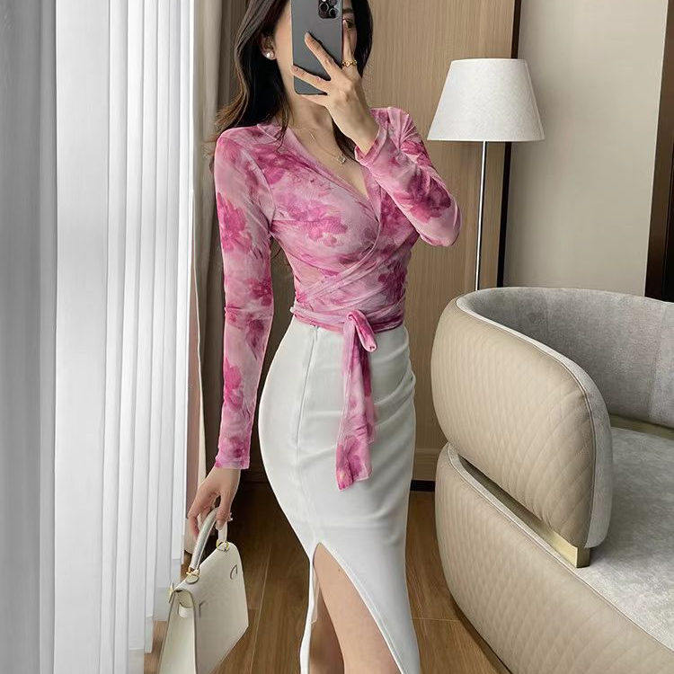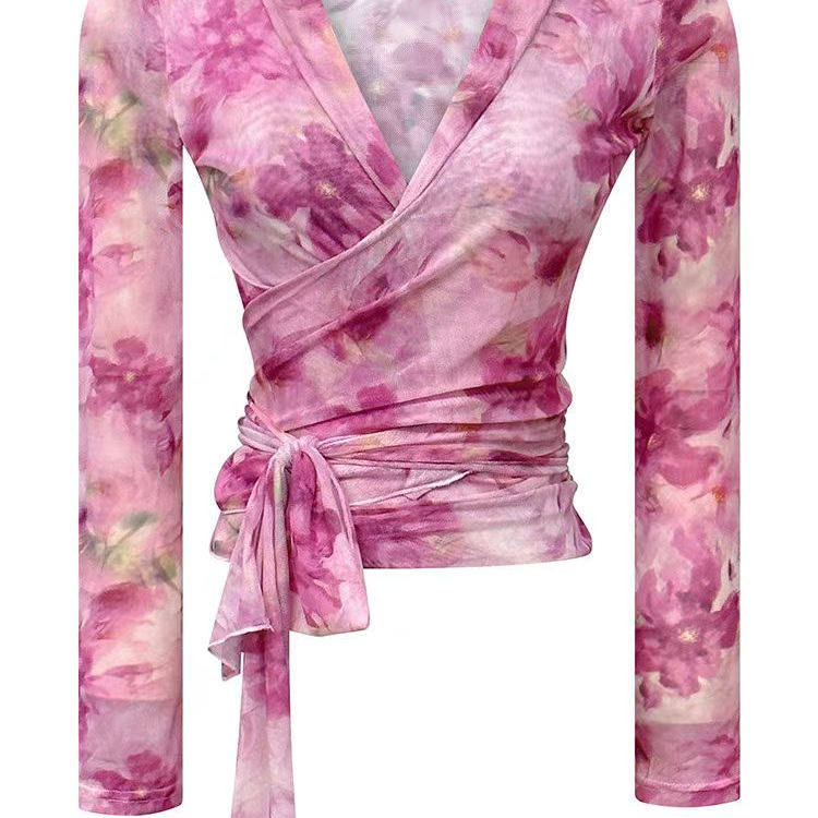 2025春季新款时尚气质女人味百搭网纱V领绑带衬衫女粉紫色上衣潮