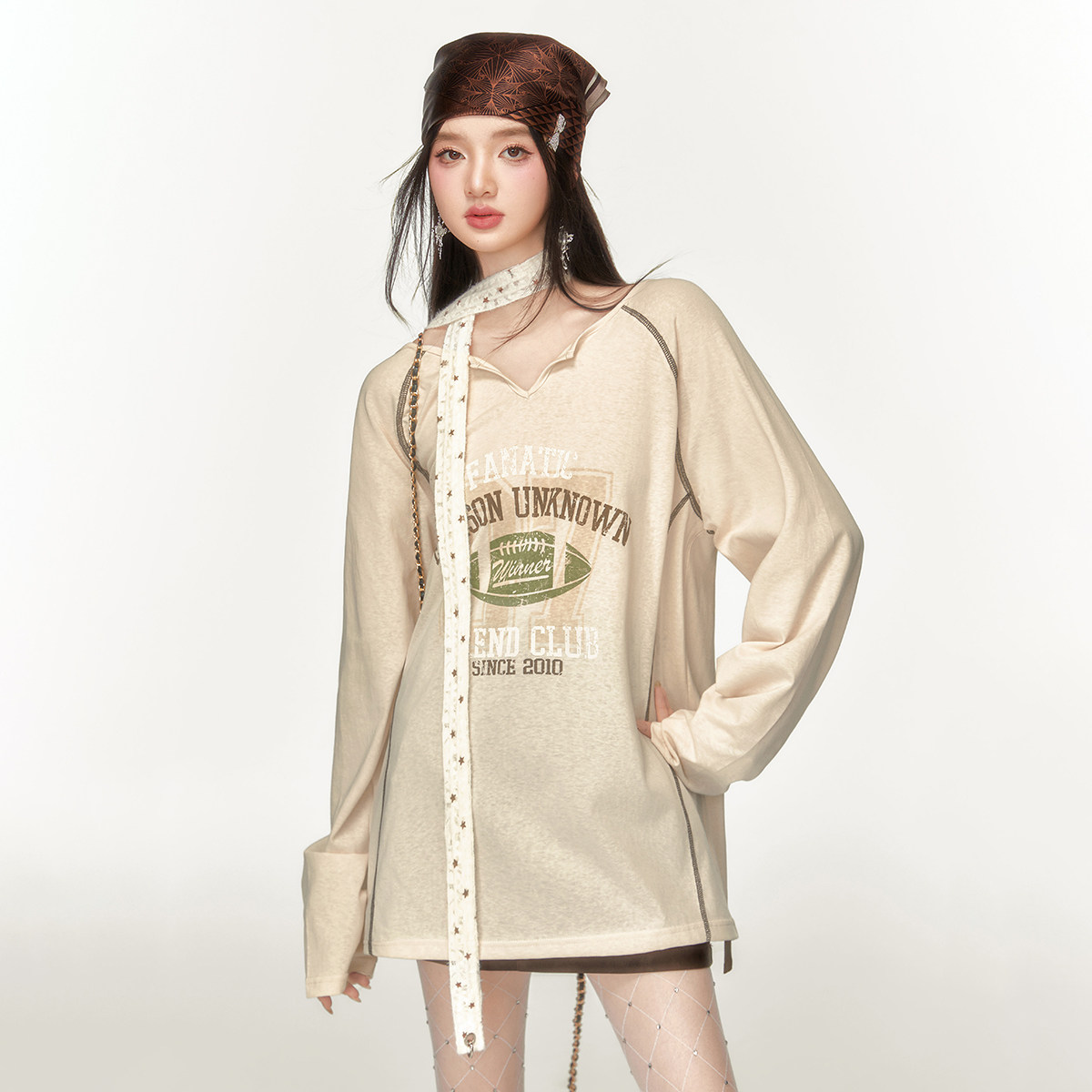 EPTISON长袖T恤女2025夏季新款宽松复古独特印花插肩袖休闲上衣