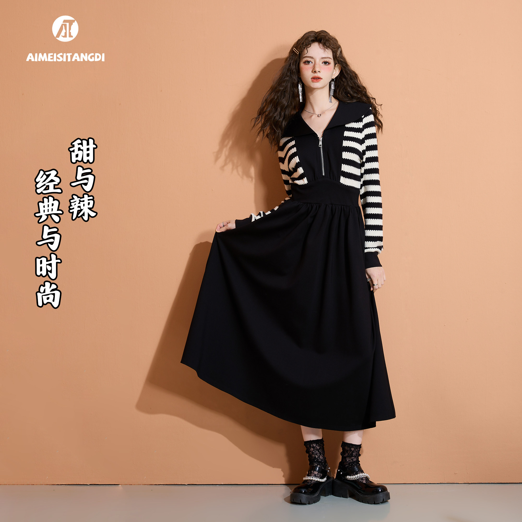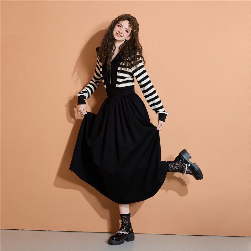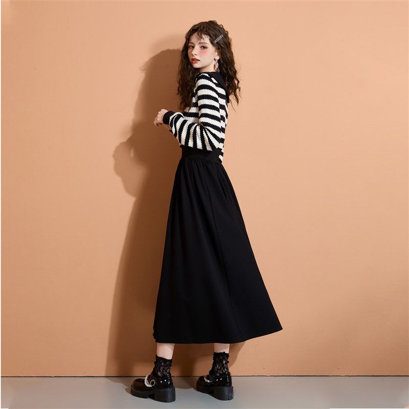 法式轻奢小众条纹连衣裙女春秋针织拼接中长款晚宴聚会礼服裙