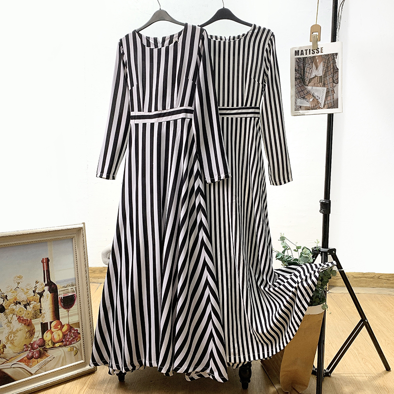 老厂货!复古条纹通勤休闲雪纺连衣裙/长袖飘逸大摆A字长裙女春夏