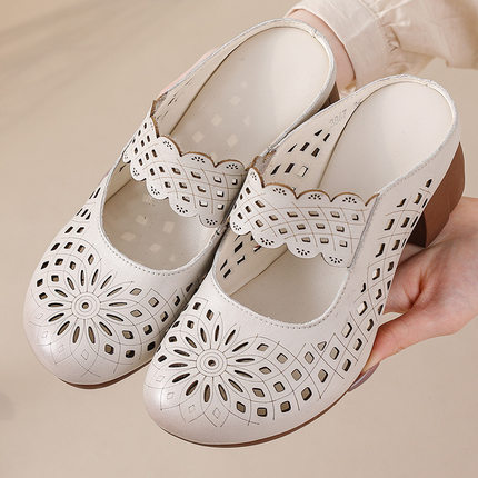头层牛皮真皮女士拖鞋夏季粗跟中跟中老年妈妈镂空包头凉拖女复古