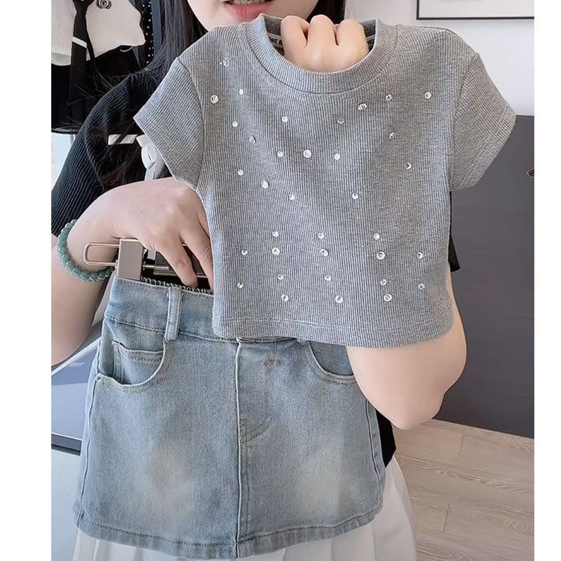 宝宝女童夏季烫钻短袖2025中大童t恤新款洋气修身圆领儿童上衣