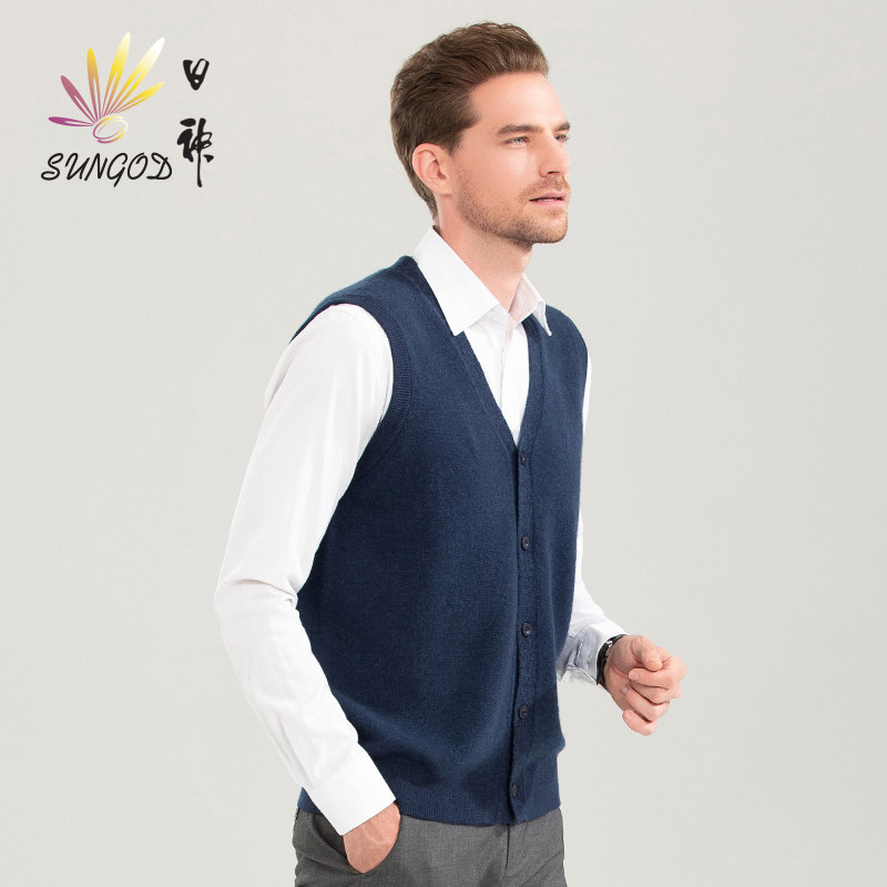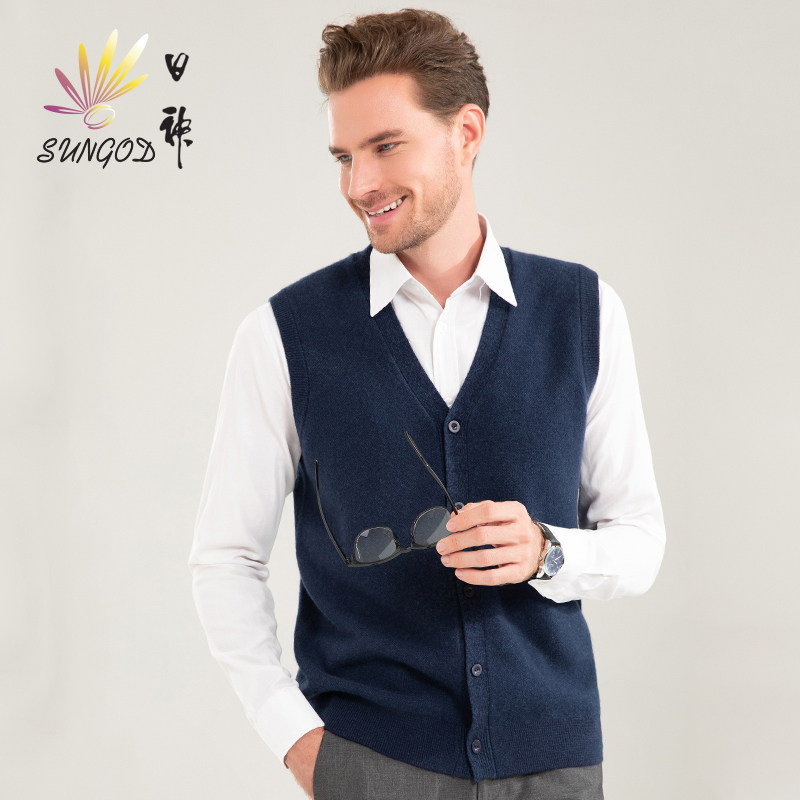 日神v领羊绒背心男秋冬中老年纯色针织开衫毛衣马甲内搭坎肩