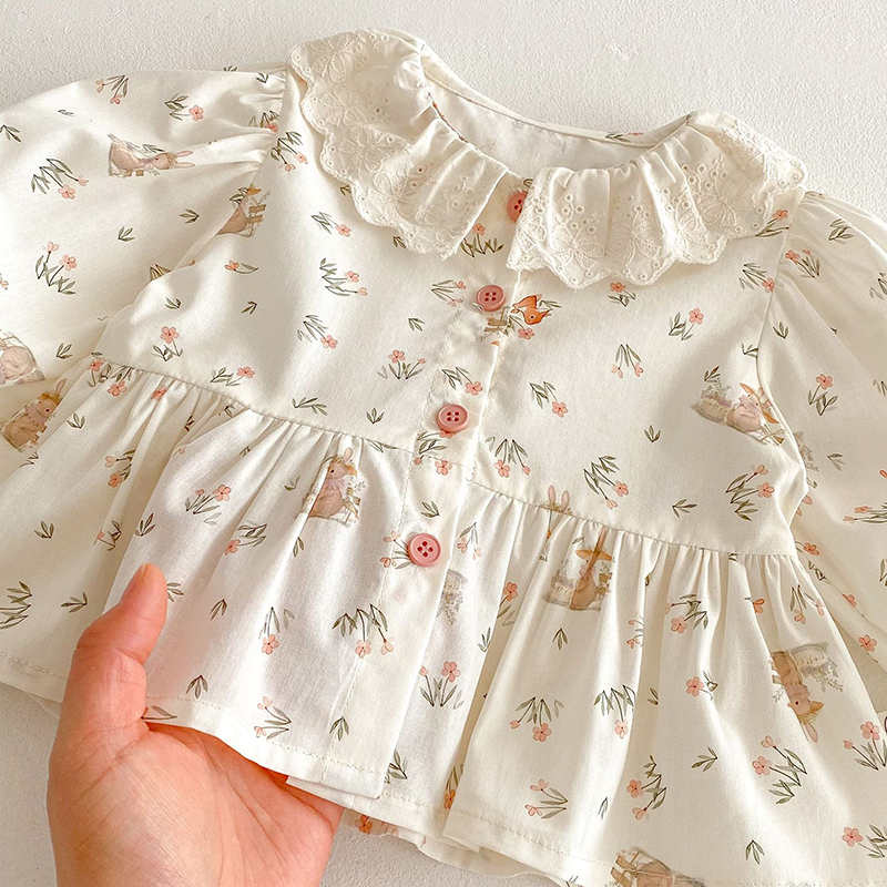 女童可爱衬衫2025新款春秋装宝宝韩版洋气小兔碎花时尚花边领衬衫