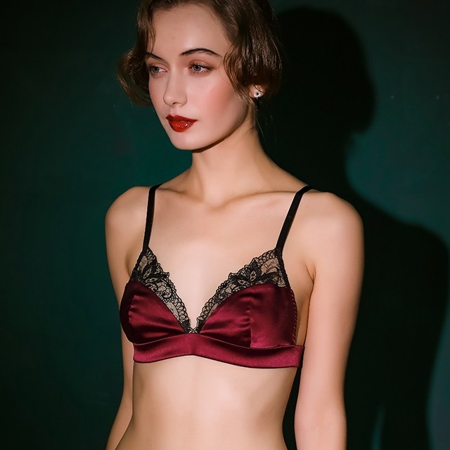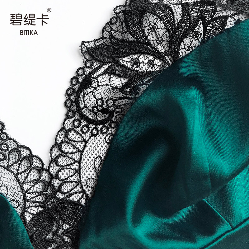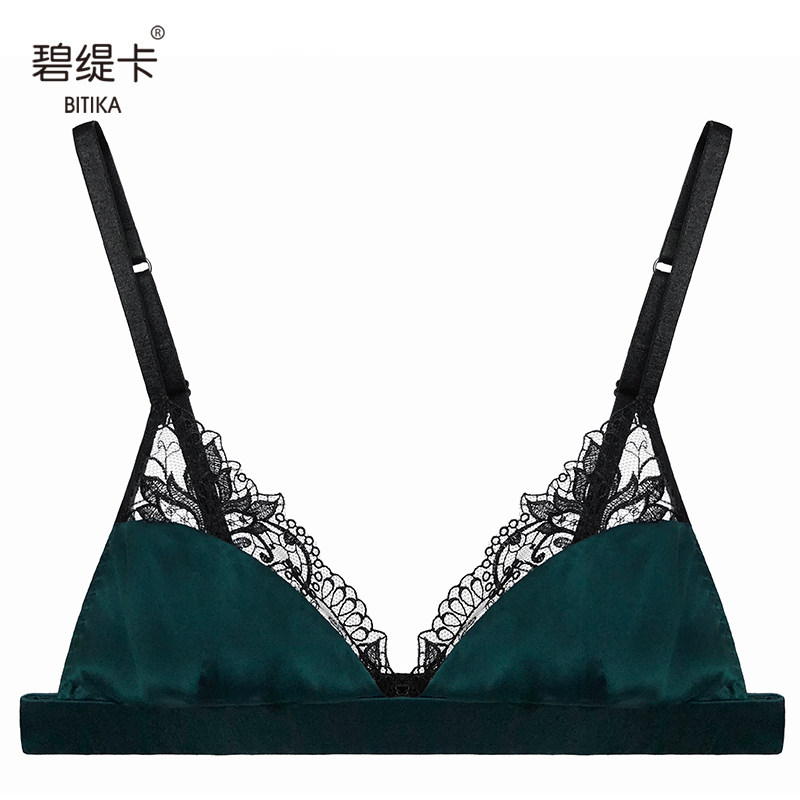 桑蚕丝三角杯性感无钢圈小胸内衣舒适复古绿色法式蕾丝三角杯文胸