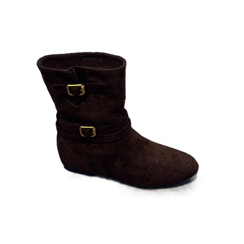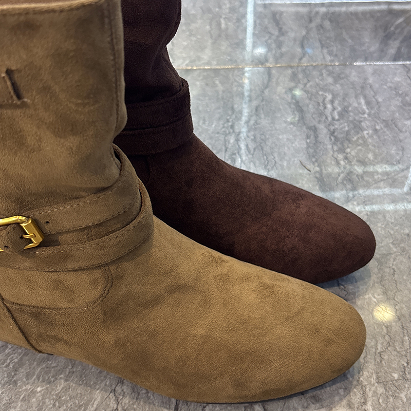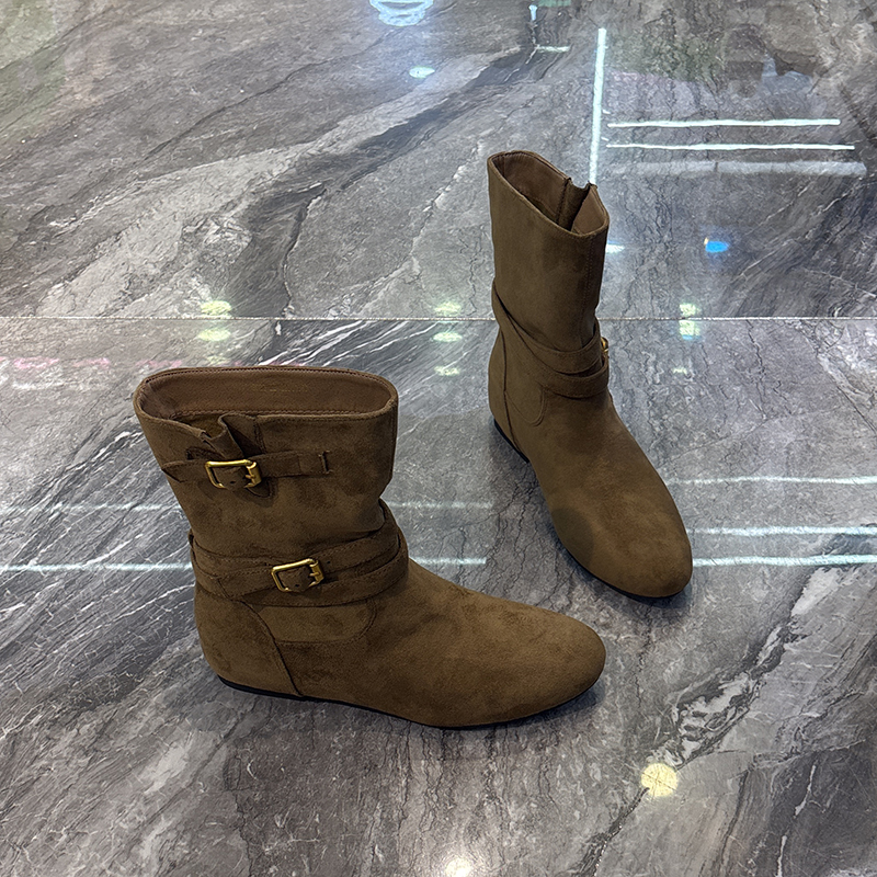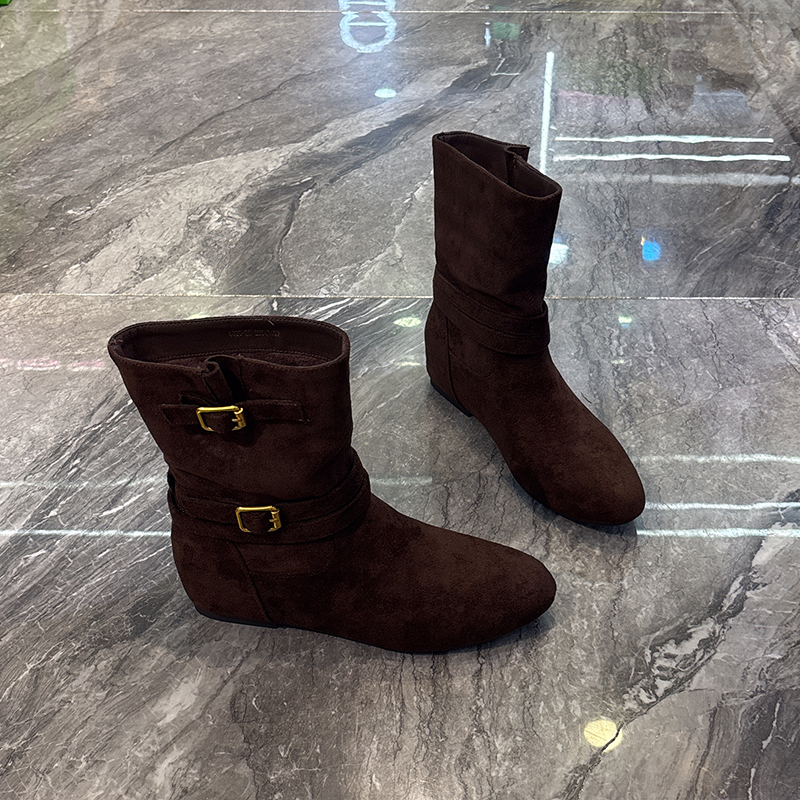 时髦尖头~复古褶皱显瘦短靴女2025冬季新款气质皮带扣西部牛仔靴