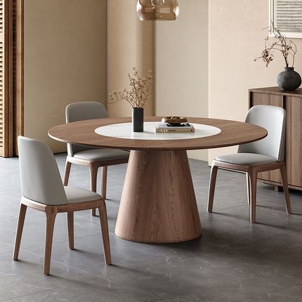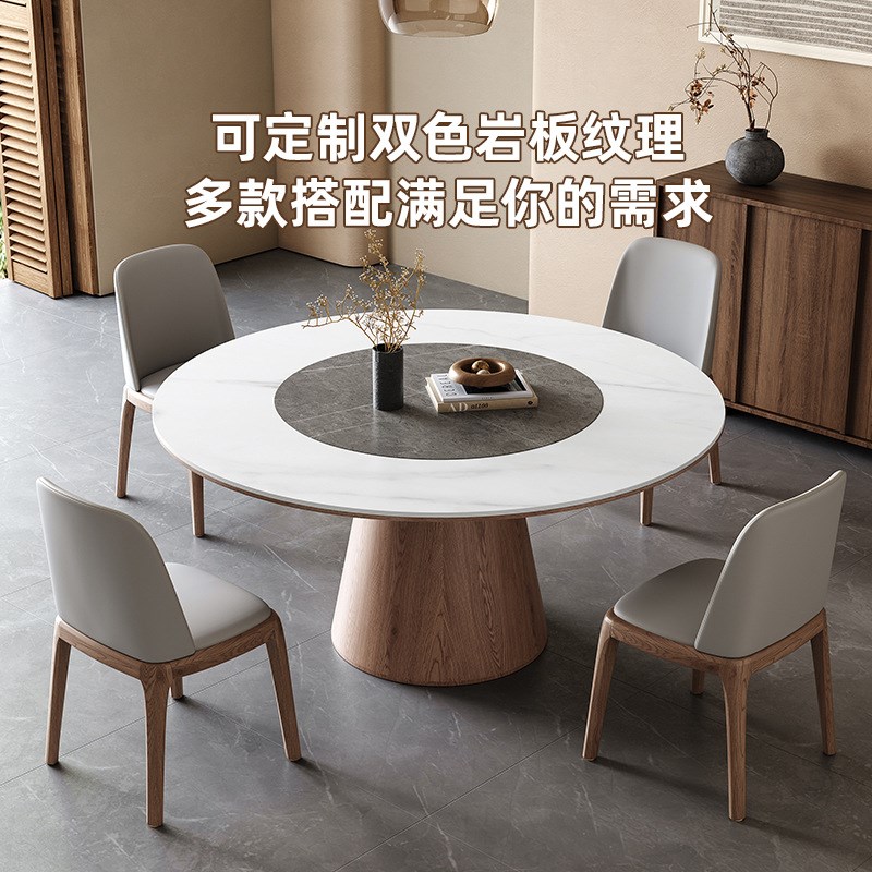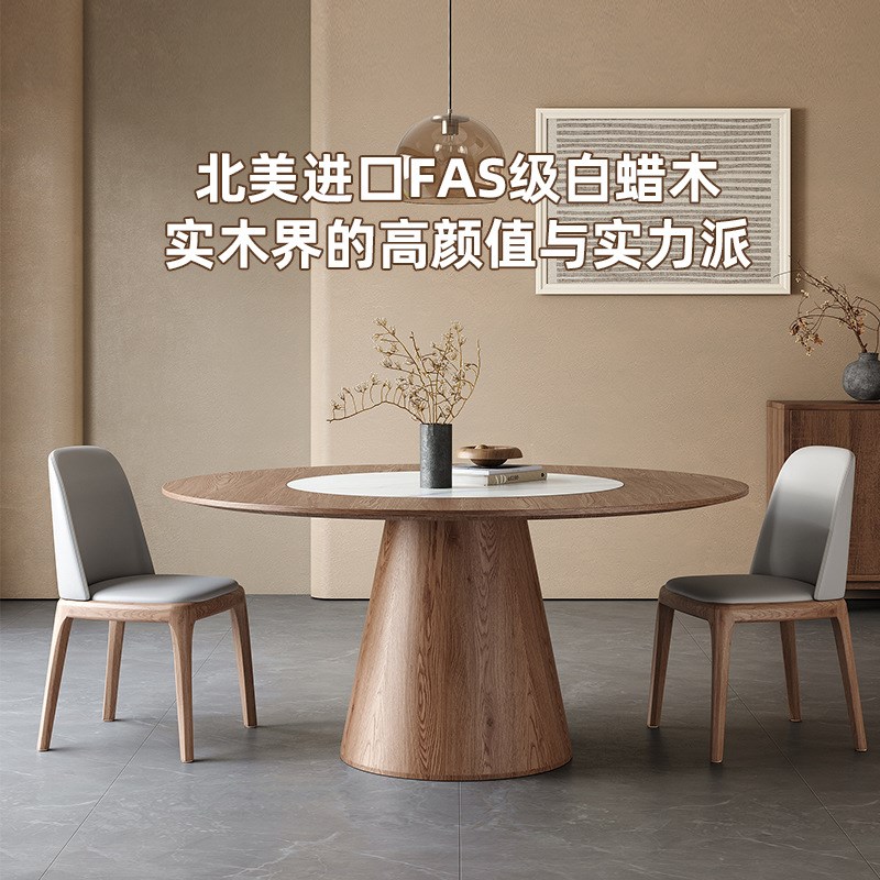 中古风实木圆形餐桌内嵌转盘现代简约家用圆桌大户型白蜡木饭桌子