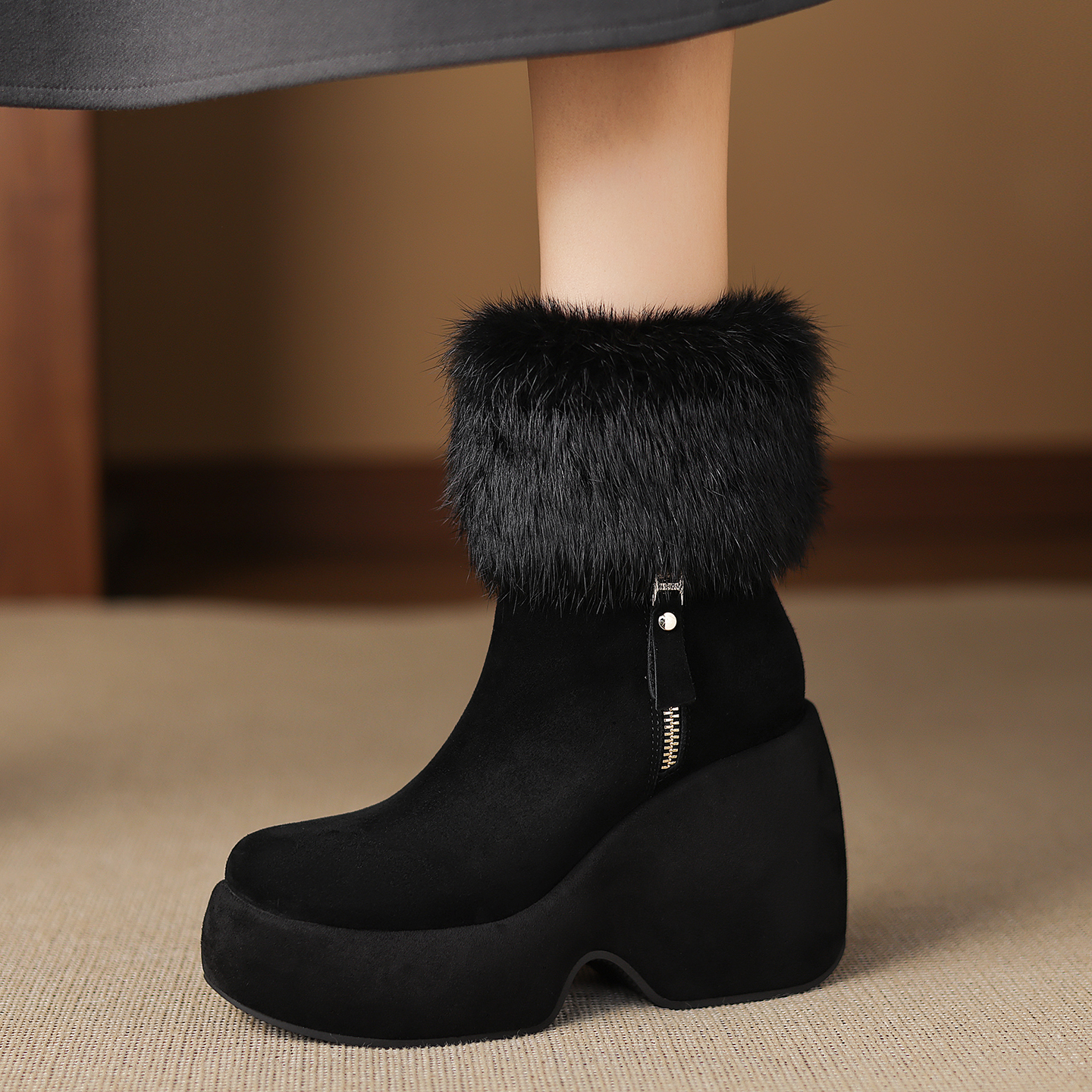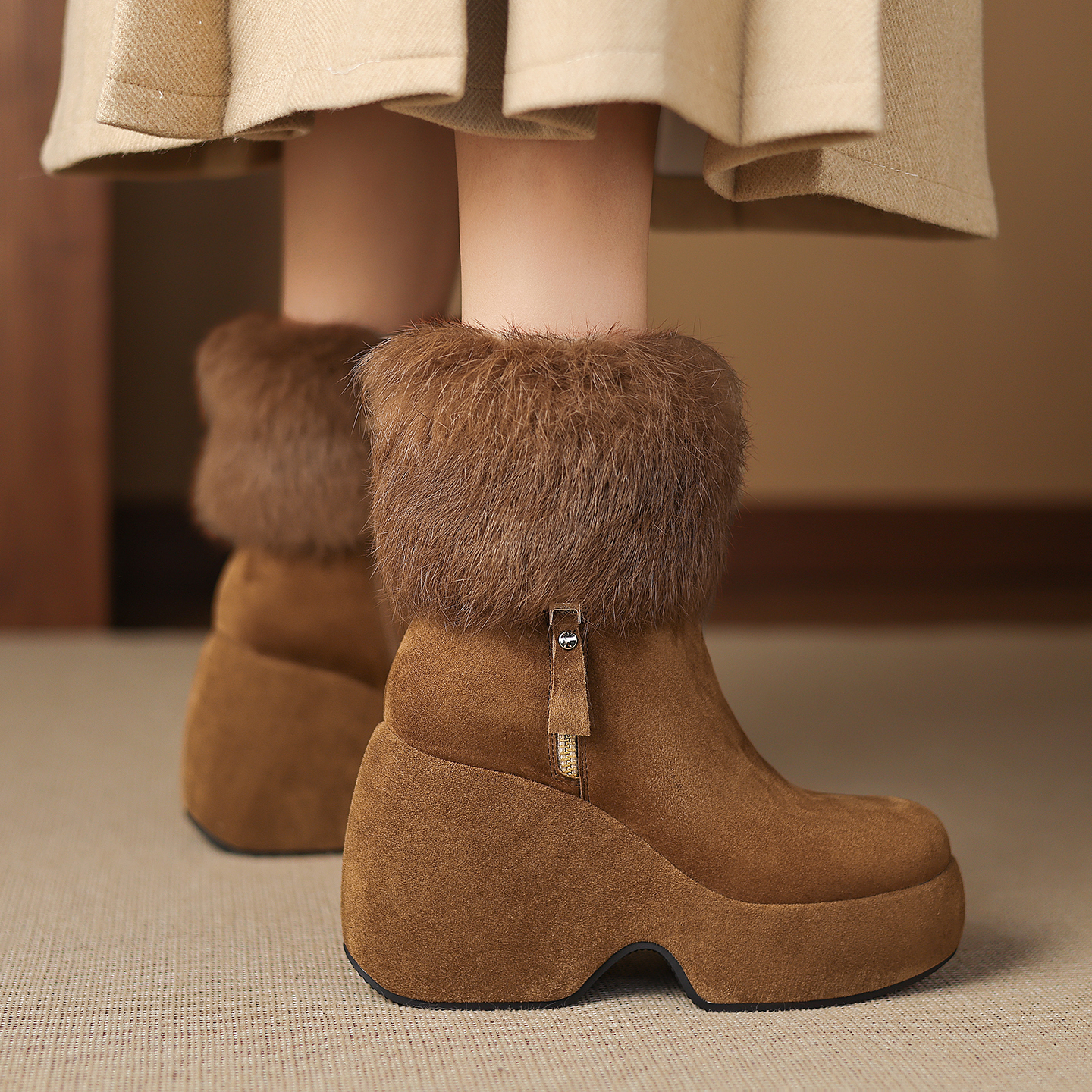 10cm超高跟坡跟厚底雪地靴女2025新款磨砂真皮兔毛加绒保暖短靴子