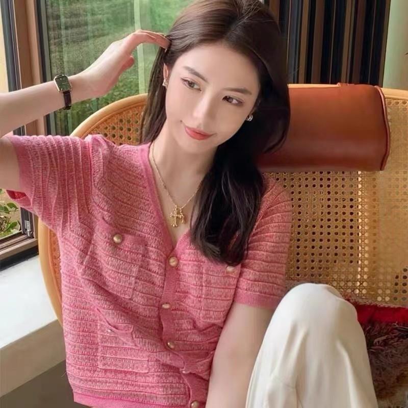 粉色小香风冰丝V领短袖T恤女夏季薄款宽松针织开衫小个子短款上衣