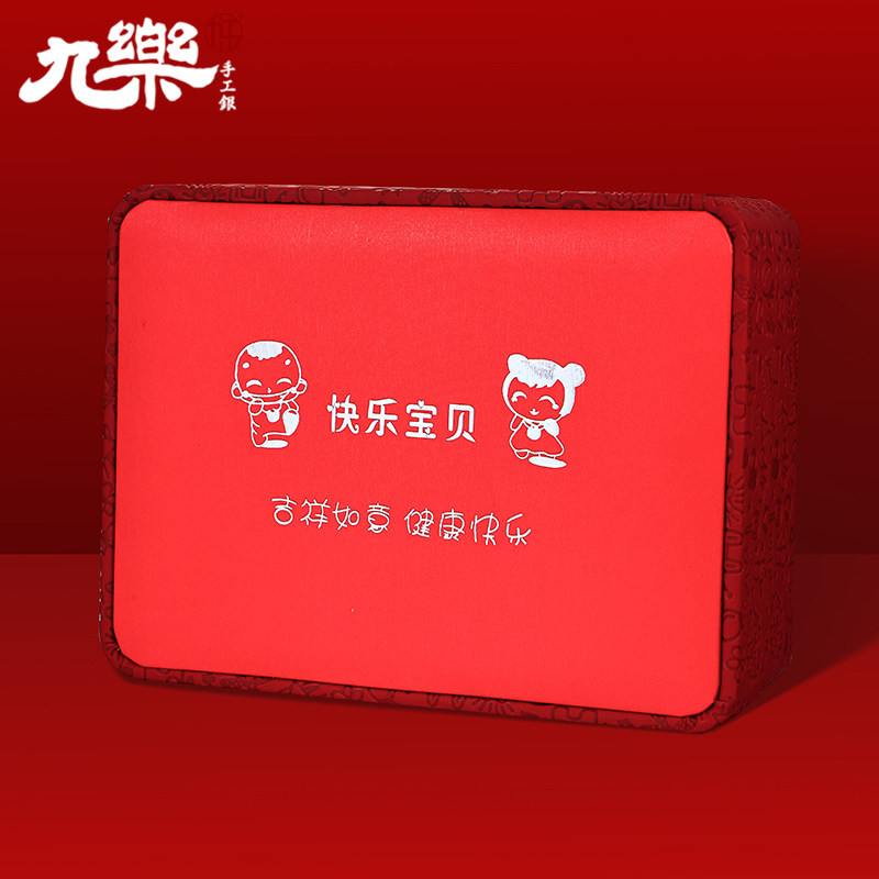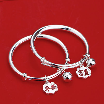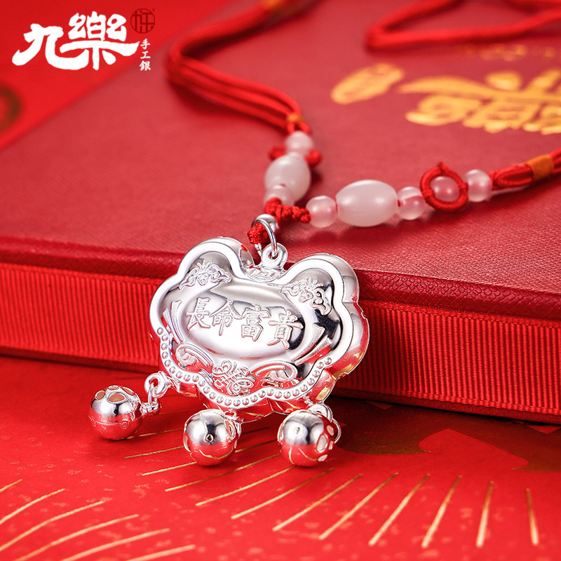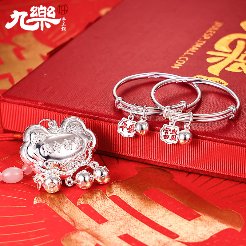永兴银楼999纯银宝宝银手镯套装婴儿百日长命锁镂空吊坠平安富贵
