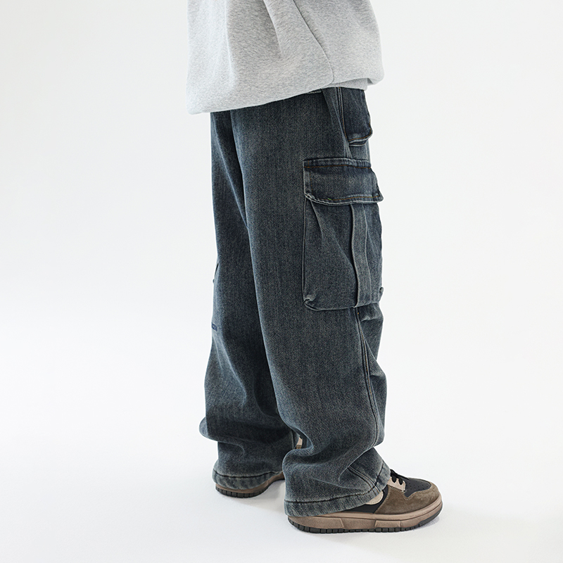 重工水洗灰蓝色加厚一体绒牛仔裤