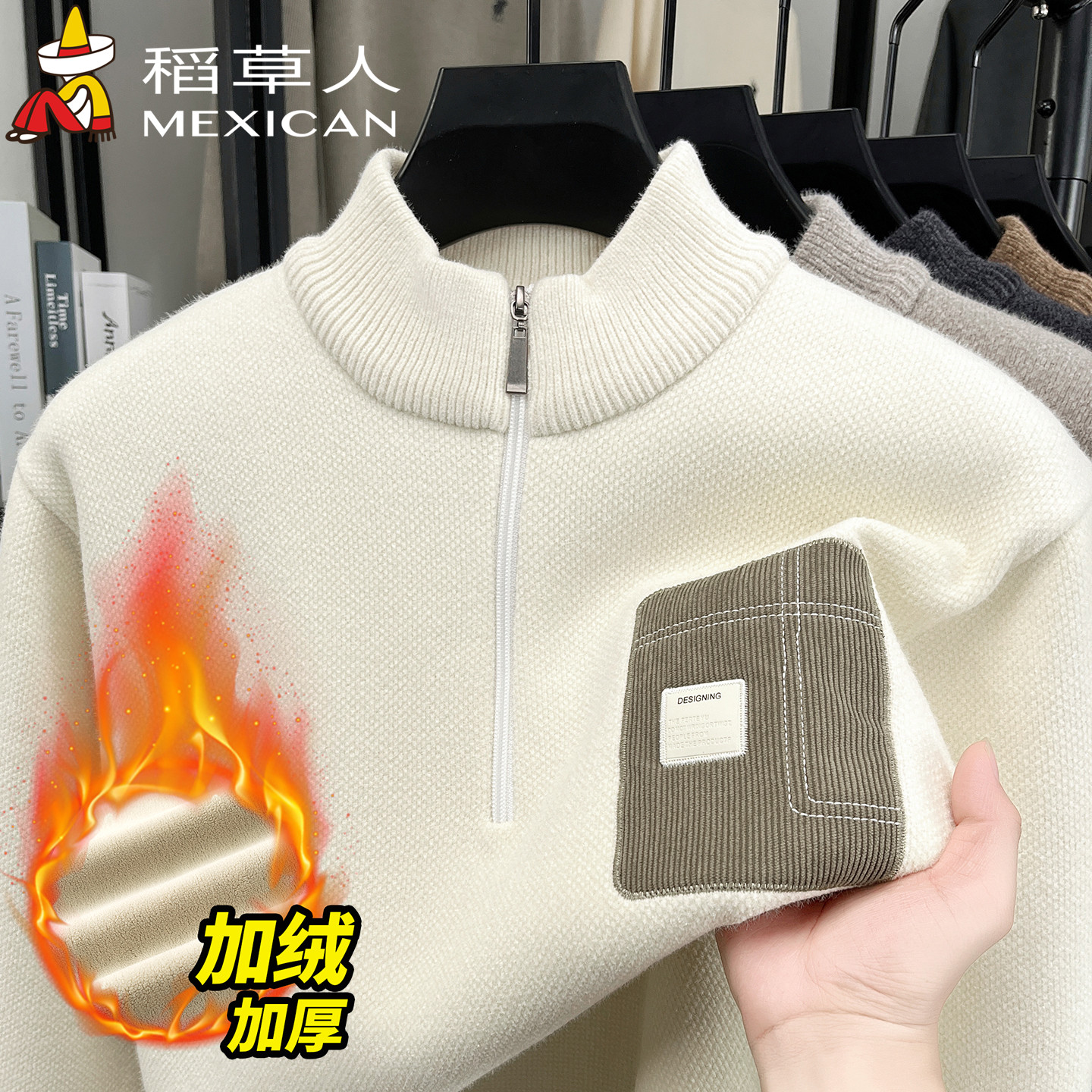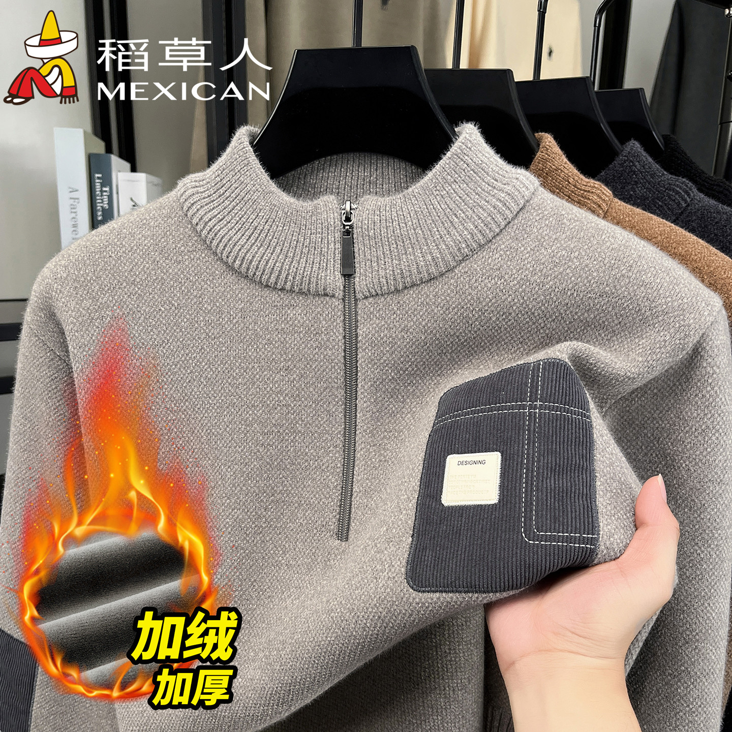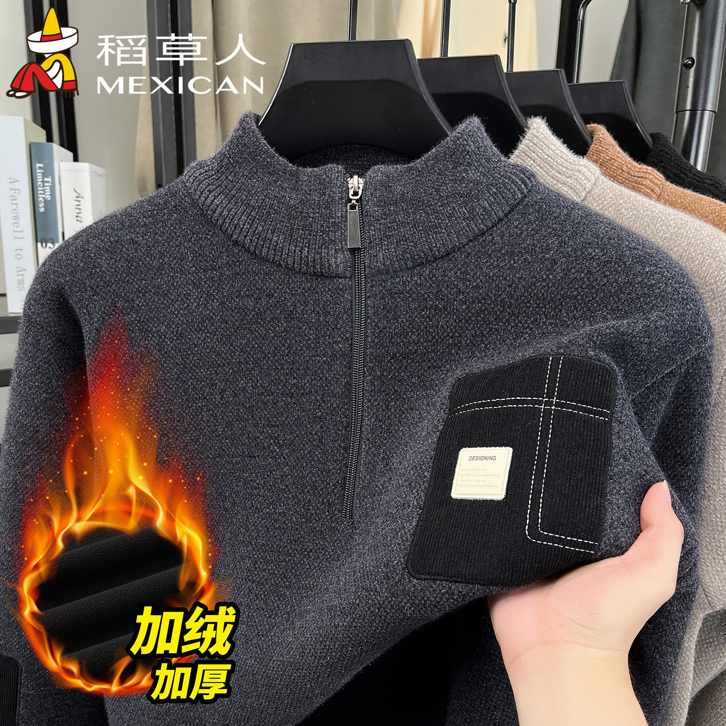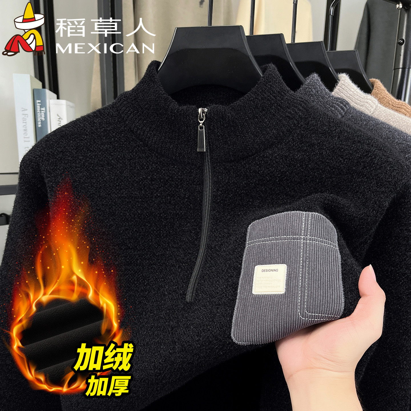 不起球稻草人雪貂绒冬季半拉链毛衣男士加绒加厚半高领针织打底衫
