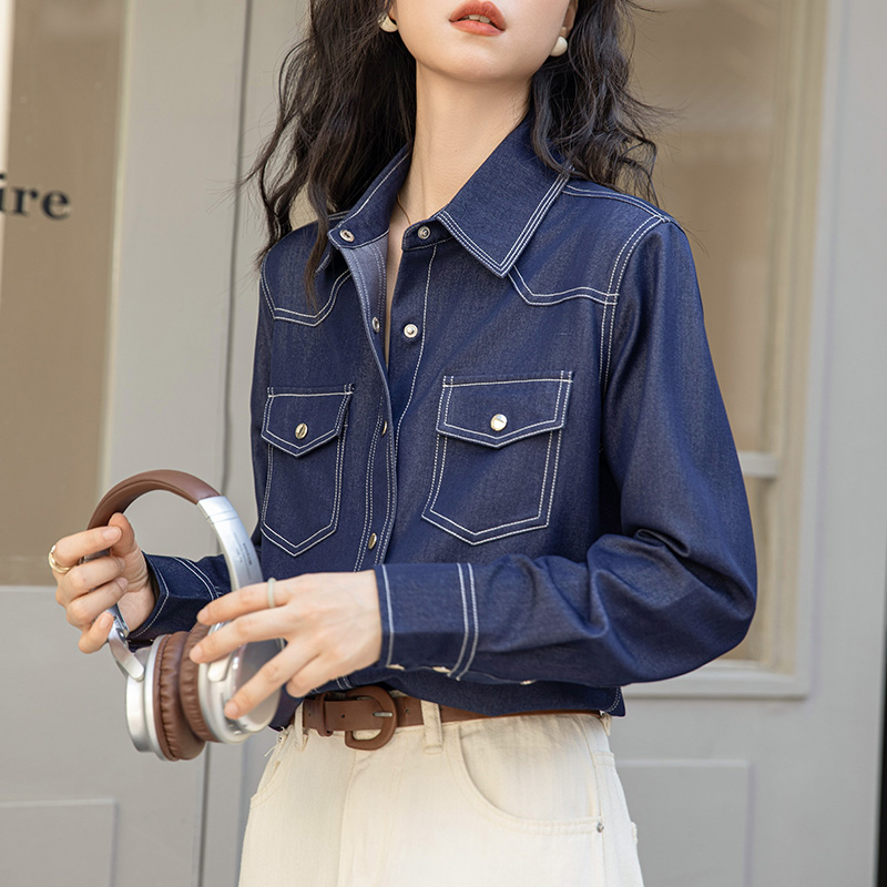 实拍蓝色牛仔衬衫女春秋叠穿设计感小众复古港味宽松长袖上衣