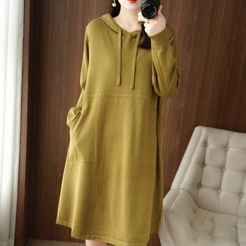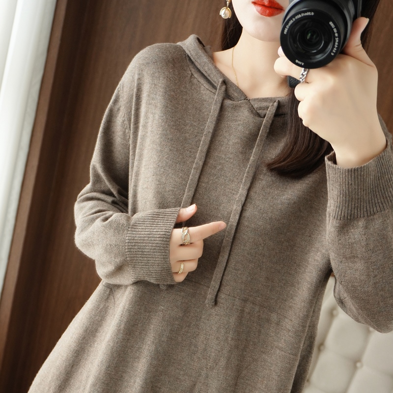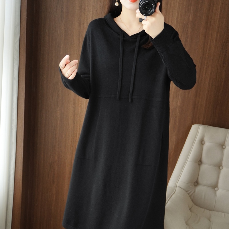 中长款连帽套头长袖针织毛衣裙女宽松毛衫中长款连衣裙针织帽衫女